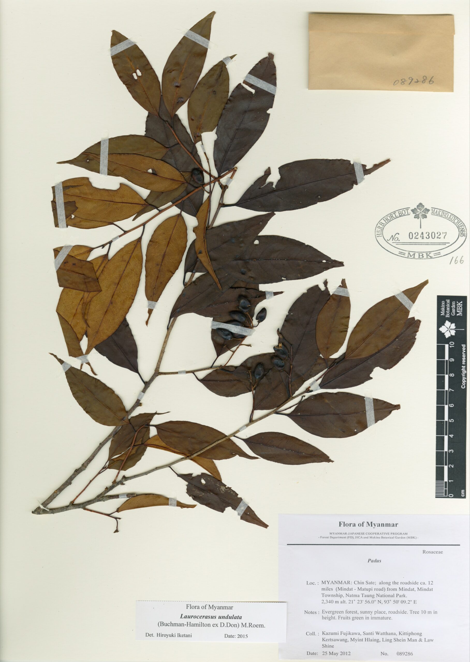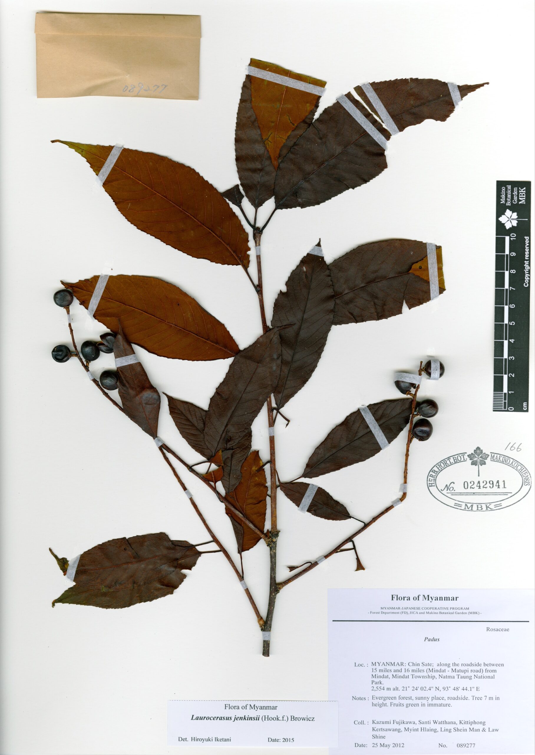 Rosaceae | Laurocerasus jenkinsii (Hook.f.) Browicz | MYANMAR: Chin State; along the roadside between 15 miles and 16 miles (Mindat-Matupi road) from Mindat, Mindat Township, Natma Taung National Park. | 25 May 2012 | Kazumi Fujikawa, Santi Watthana, Kittiphong Kertsawang, Myint Hlaing, Ling Shein Man & Law Shine; | 089277 | 0242941 |
