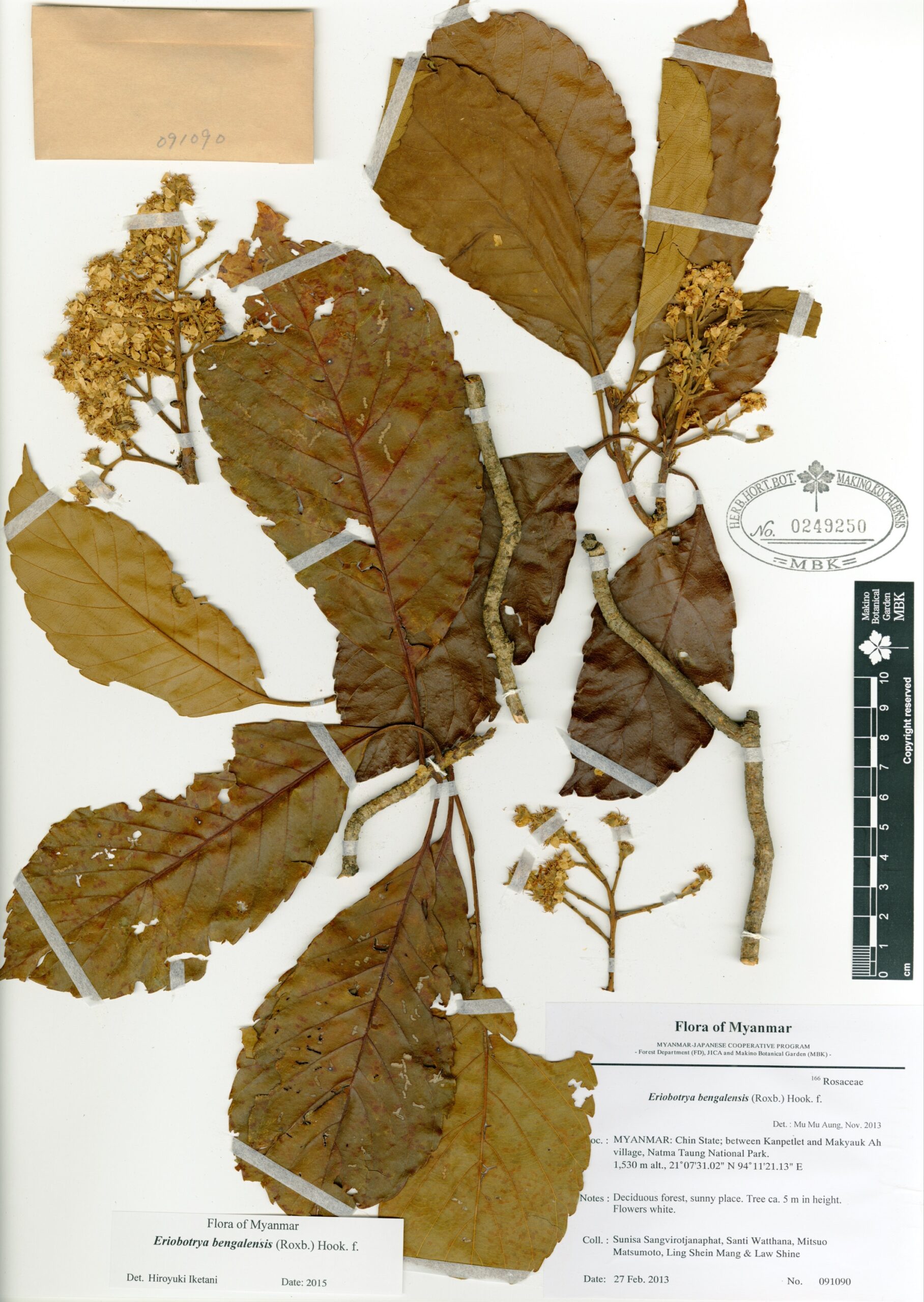 Rosaceae | Eriobotrya bengalensis (Roxb.) Hook. f. | MYANMAR: Chin State; between Kanpetlet and Makyauk Ah village, Natma Taung National Park. | 27 February 2013 | Sunisa Sangvirotjanaphat, Santi Watthana, Mitsuo Matsumoto, Ling Shein Mang & Law Shine; | 091090 | 0249250 |