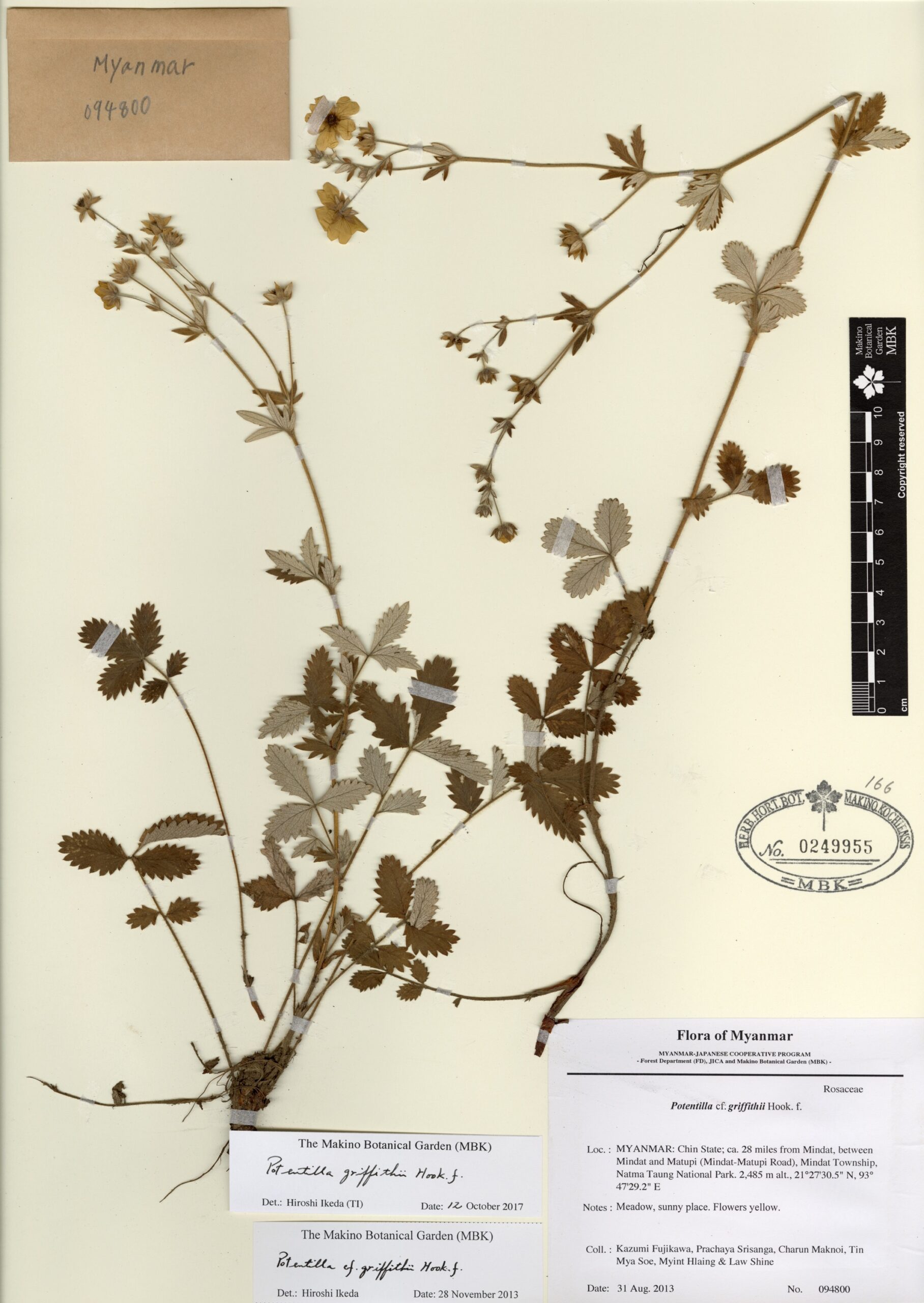 Rosaceae | Potentilla griffithii Hook.f. | MYANMAR: Chin State; ca. 28 miles from Mindat, between Mindat and Matupi (Mindat-Matupi Road), Mindat Township, Natma Taung National Park. | 31 August 2013 | Kazumi Fujikawa, Prachaya Srisanga, Charun Maknoi, Tin Mya Soe, Myint Hlaing & Law Shine; | 094800 | 0249955 |