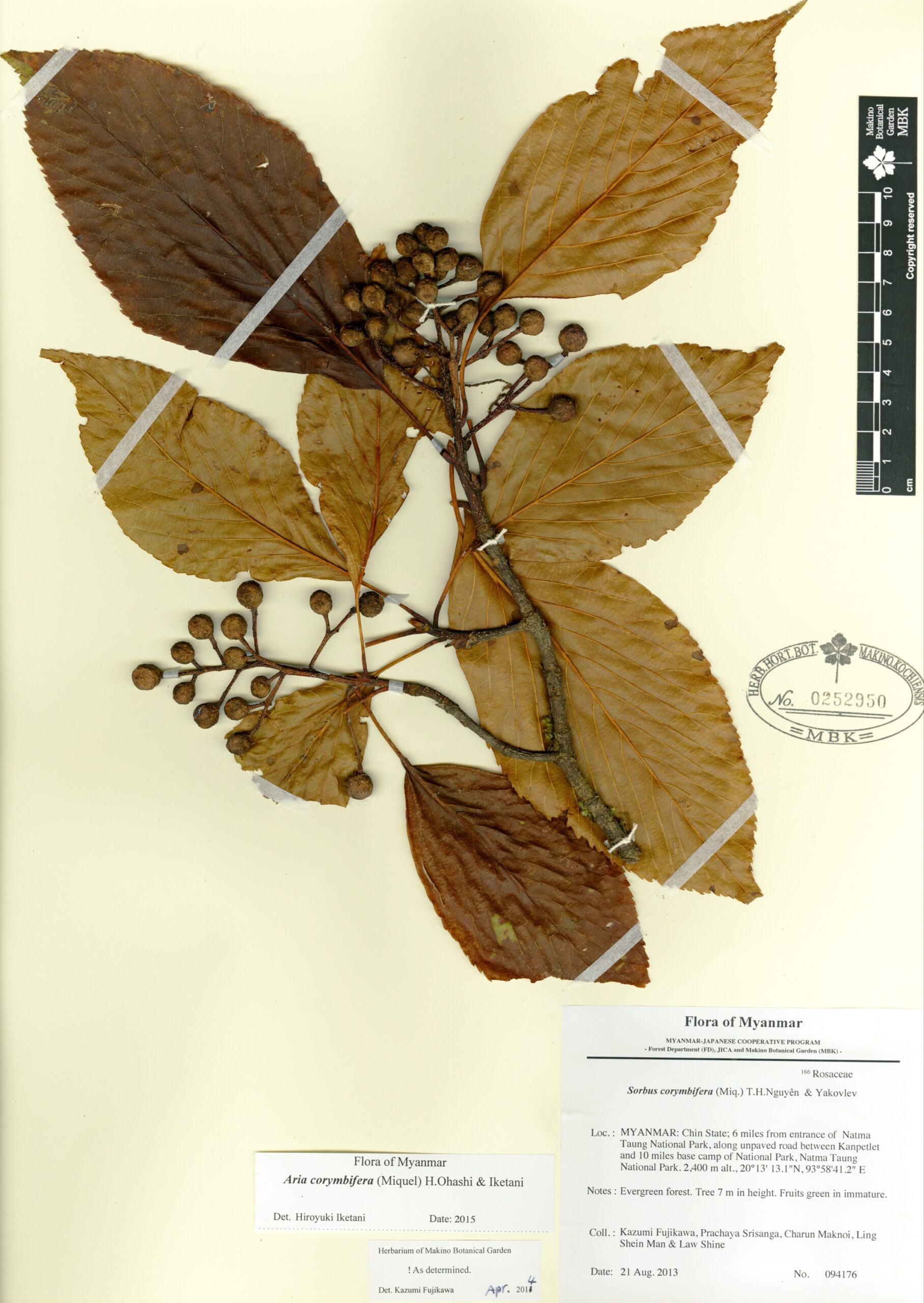 Rosaceae | Aria corymbifera (Miquel) H.Ohashi & Iketani | MYANMAR: Chin State; 6 miles from entrance of Natma Taung National Park, along unpaved road between Kanpetlet and 10 miles base camp of National Park, Natma Taung National Park. | 21 August 2013 | Kazumi Fujikawa, Prachaya Srisanga, Charun Maknoi, Ling Shein Man & Law Shine; | 094176 | 0252950 |