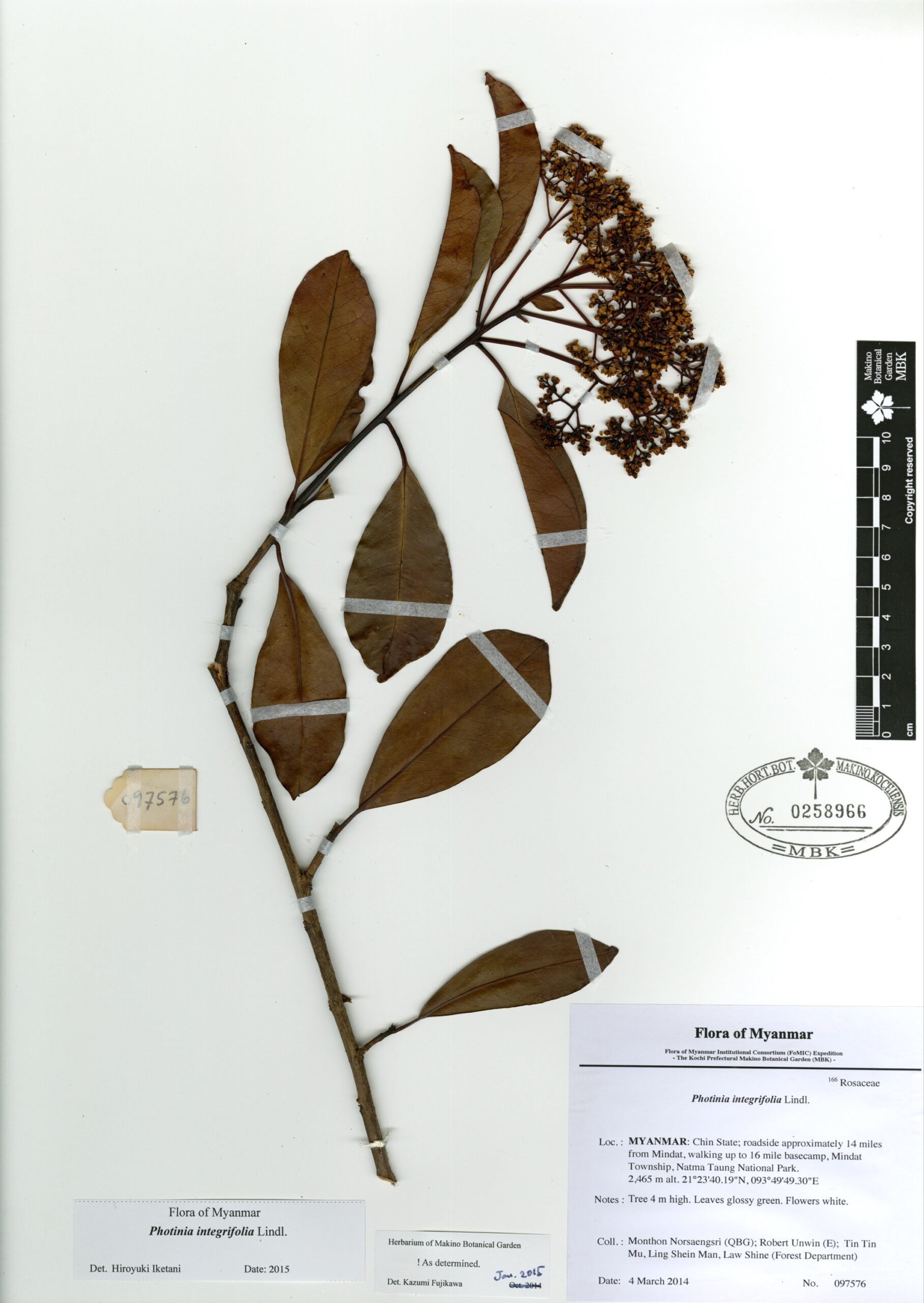 Rosaceae | Photinia integrifolia Lindl. | MYANMAR: Chin State; roadside approximately 14 miles from Mindat, walking up to 16 mile basecamp, Mindat Township, Natma Taung National Park. | 4 March 2014 | Monthon Norsaengsri (QBG); Robert Unwin (E); Tin Tin Mu, Ling Shein Man, Law Shine (Forest Department); | 097576 | 0258966 |