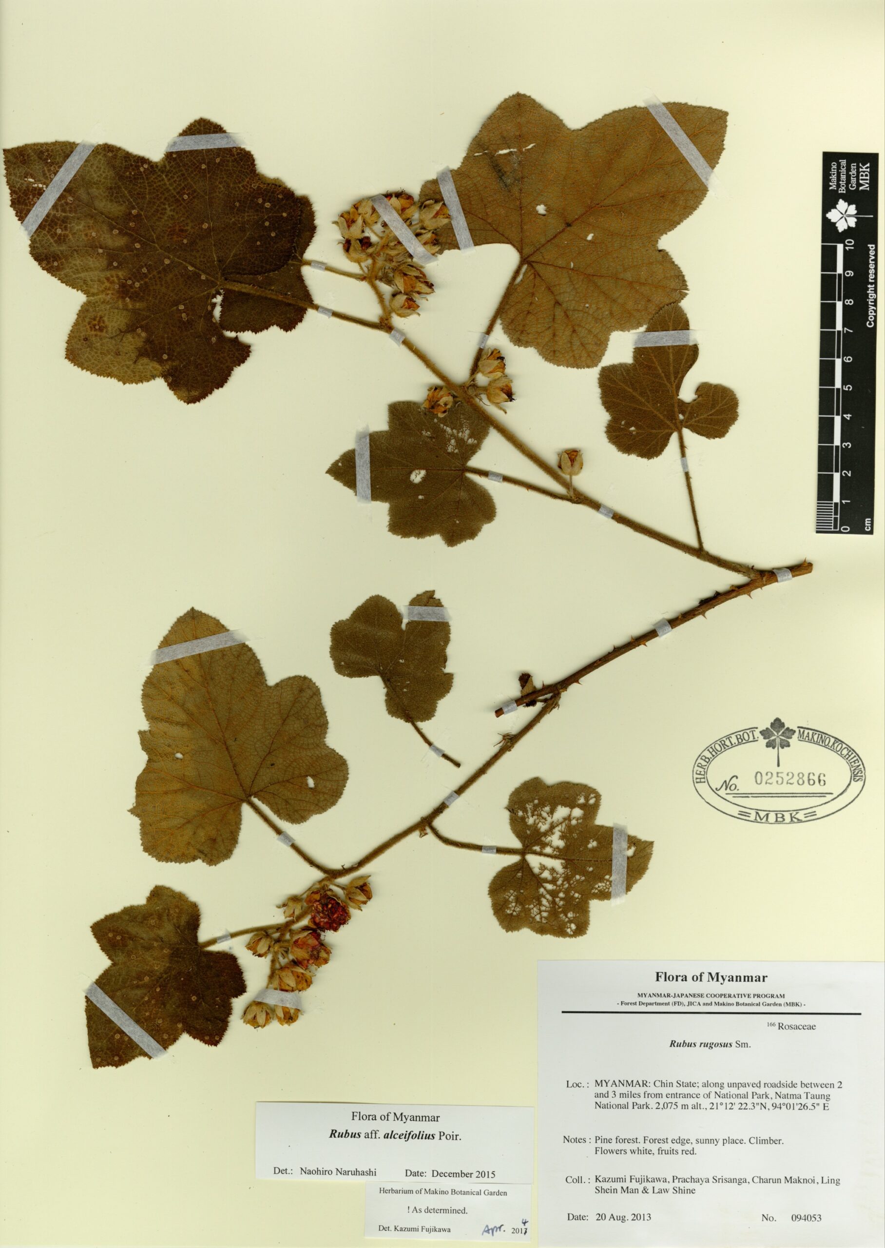 Rosaceae | Rubus aff. alceifolius Poir. | MYANMAR: Chin State; along unpaved roadside between 2 and 3 miles from entrance of National Park, Natma Taung National Park. | 20 August 2013 | Kazumi Fujikawa, Prachaya Srisanga, Charun Maknoi, Ling Shein Man & Law Shine; | 094053 | 0252866 |