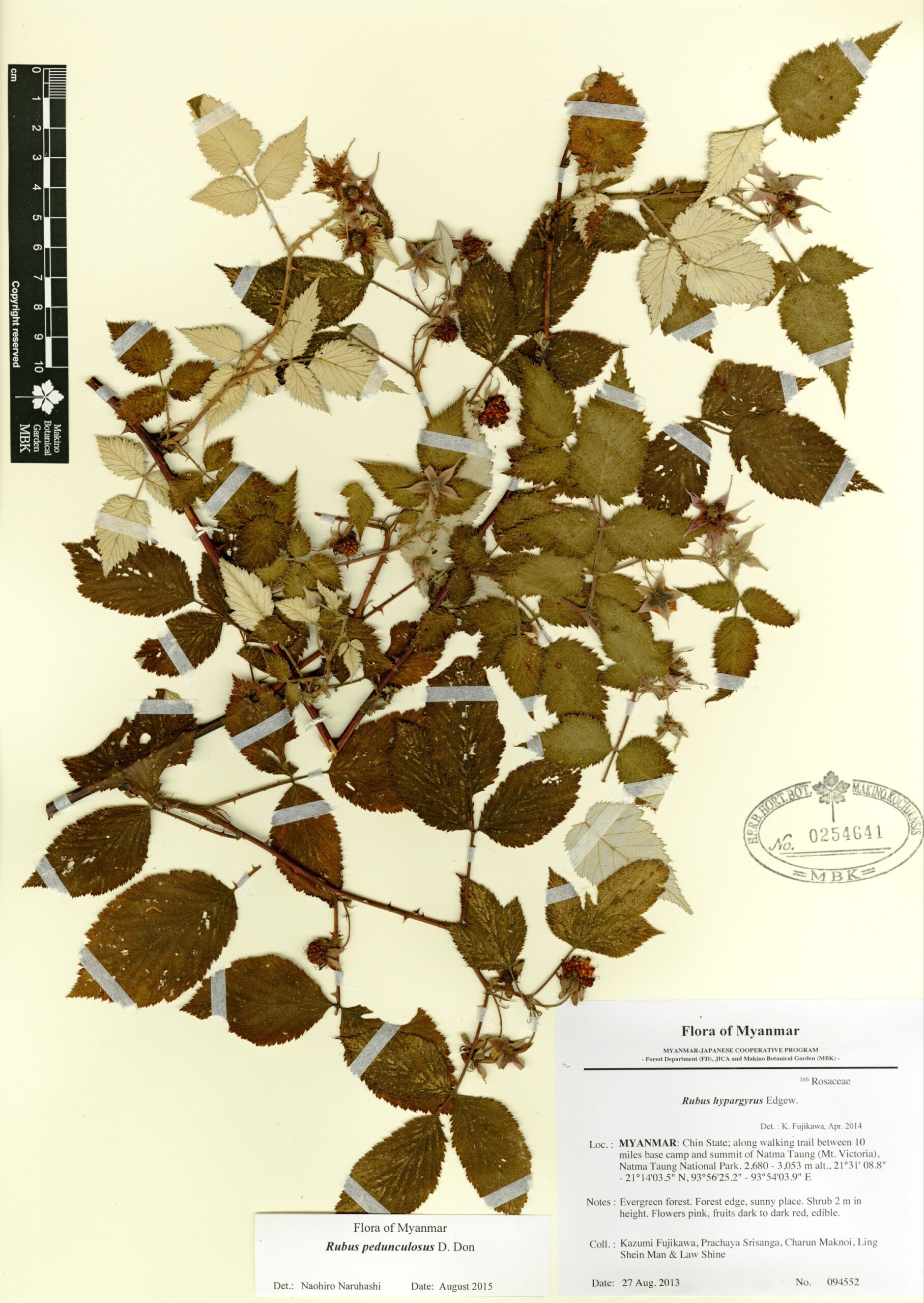 Rosaceae | Rubus pedunculosus D. Don | MYANMAR: Chin State; along walking trail between 10 miles base camp and summit of Natma Taung (Mt. Victoria), Natma Taung National Park. | 27 August 2013 | Kazumi Fujikawa, Prachaya Srisanga, Charun Maknoi, Ling Shein Man & Law Shine; | 094552 | 0254641 |