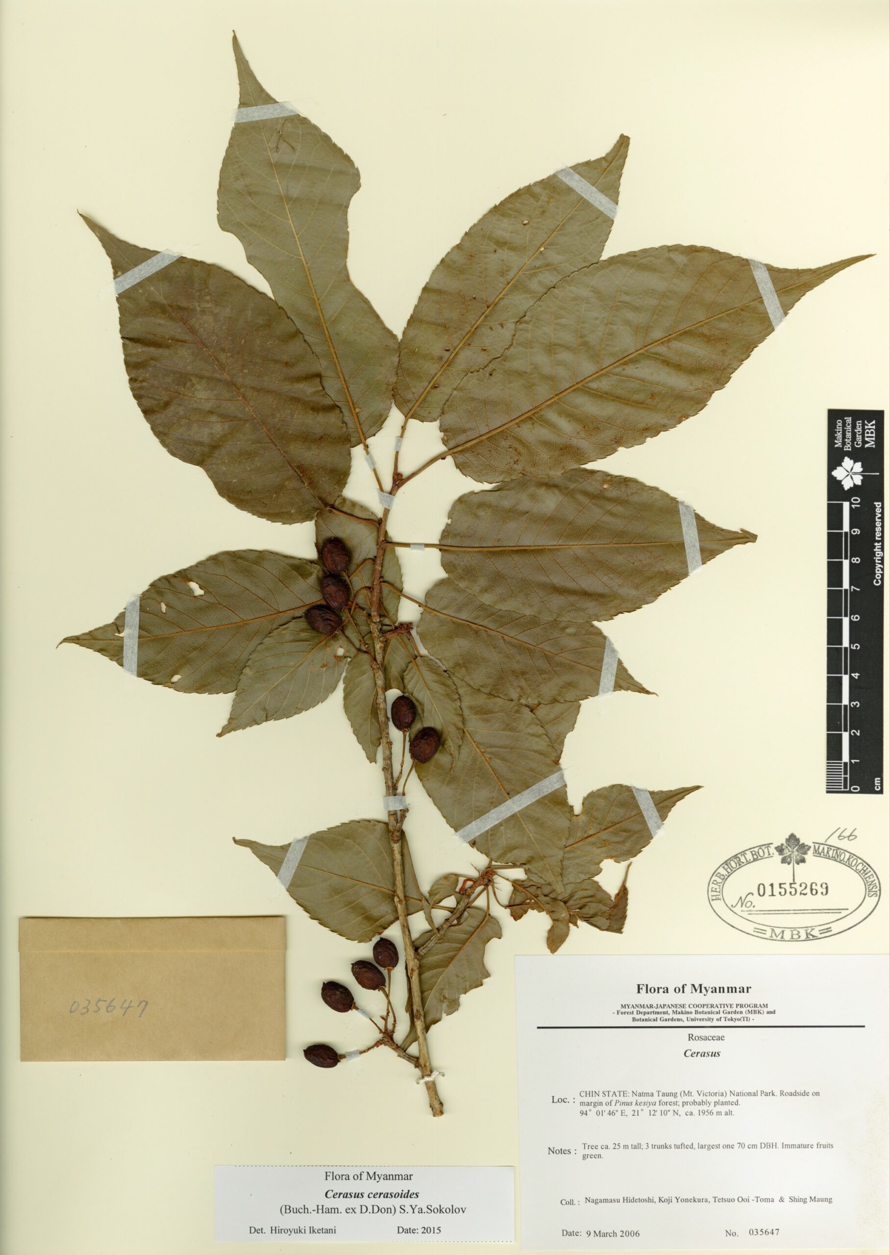 Rosaceae | Cerasus cerasoides (Buch.-Ham. ex D.Don) S.Ya.Sokolov | MYANMAR: CHIN STATE: Natma Taung (Mt. Victoria) National Park. Roadside on margin of Pinus kesiya forest; probably planted. | 9 March 2006 | Hidetoshi Nagamasu, Koji Yonekura, Tetsuo Ooi -Toma & Shing Maung; | 035647 | 0155269 |