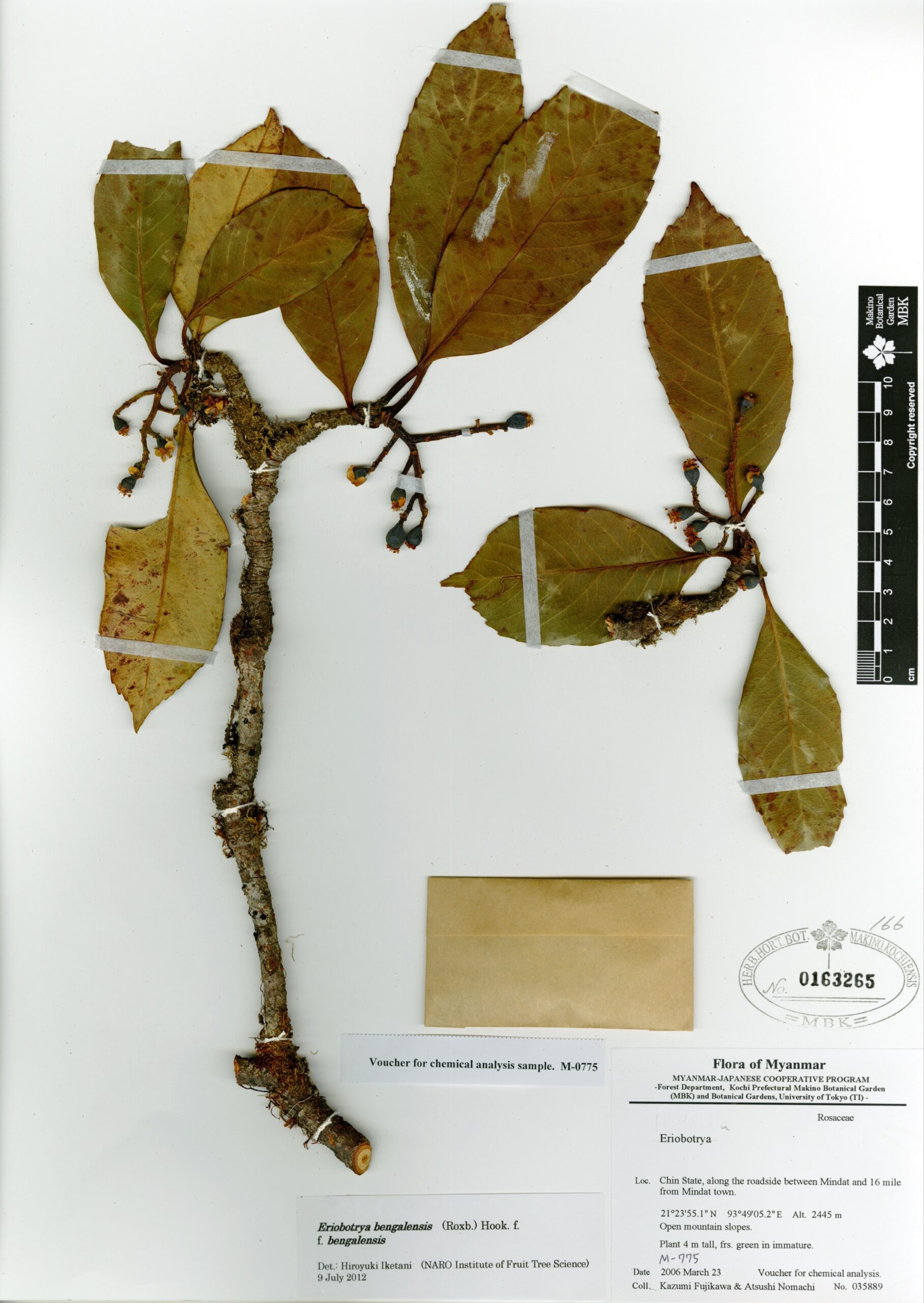 Rosaceae | Eriobotrya serrata J.E. Vidal | MYANMAR: Chin State; Near Kampetlet, road between Kampetlet and Saw, Natmataung National Park. | 22 February 2007 | Kazumi Fujikawa, Nobuhito Kuroiwa, Ayako Maeda & Aung Thay; | 050100 | 0192403 |
