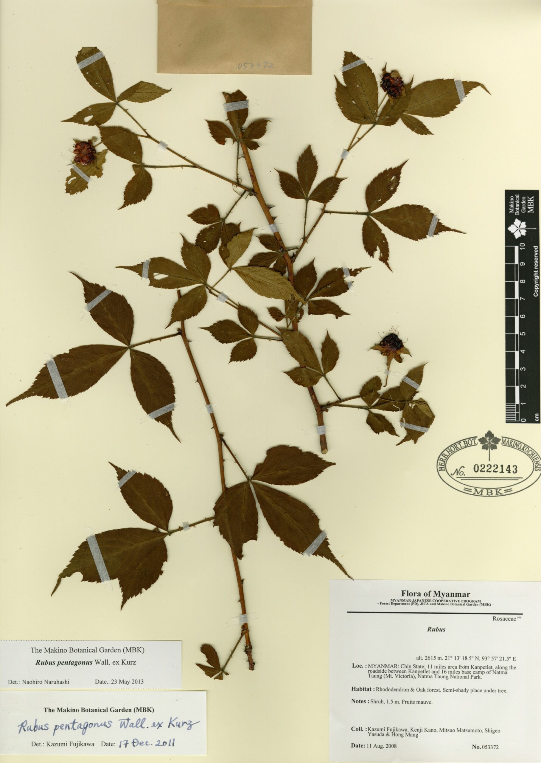 Rosaceae | Rubus pentagonus Wall. ex Kurz | MYANMAR: CHIN State; 11 miles area from Kanpetlet, along the roadside between Kanpetlet and 16 miles base camp of Natma Taung (Mt. Victoria), Natma Taung National Park. | 11 August 2008 | Kazumi Fujikawa, Kenji Kano, Mitsuo Matsumoto, Shigeo Yasuda & Hong Mang; | 053372 | 0222143 |