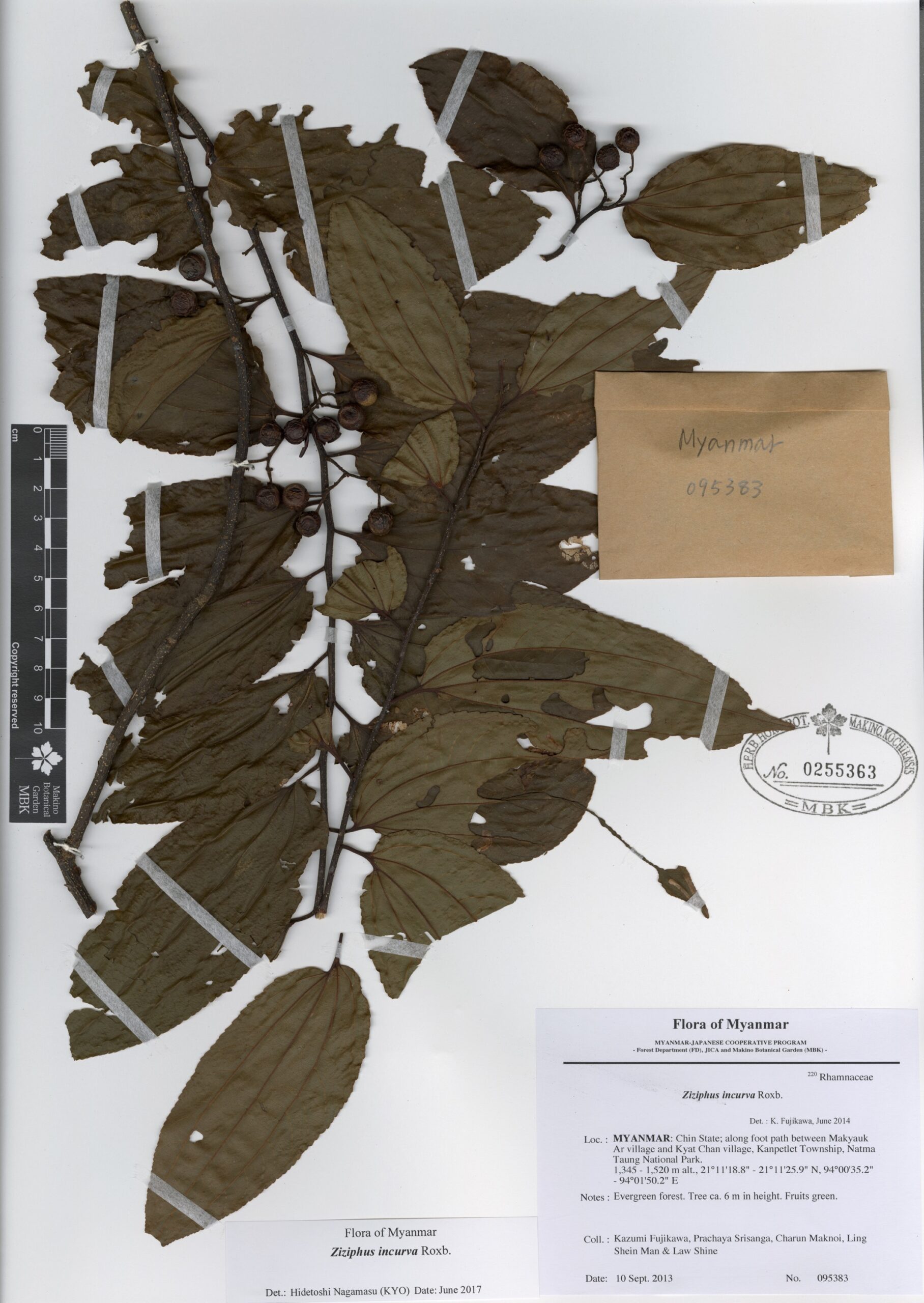 Rhamnaceae | Ziziphus incurva Roxb. | MYANMAR: Chin State; along foot path between Makyauk Ar village and Kyat Chan village, Kanpetlet Township, Natma Taung National Park. | 10 September 2013 | Kazumi Fujikawa, Prachaya Srisanga, Charun Maknoi, Ling Shein Man & Law Shine; | 095383 | 0255363 |