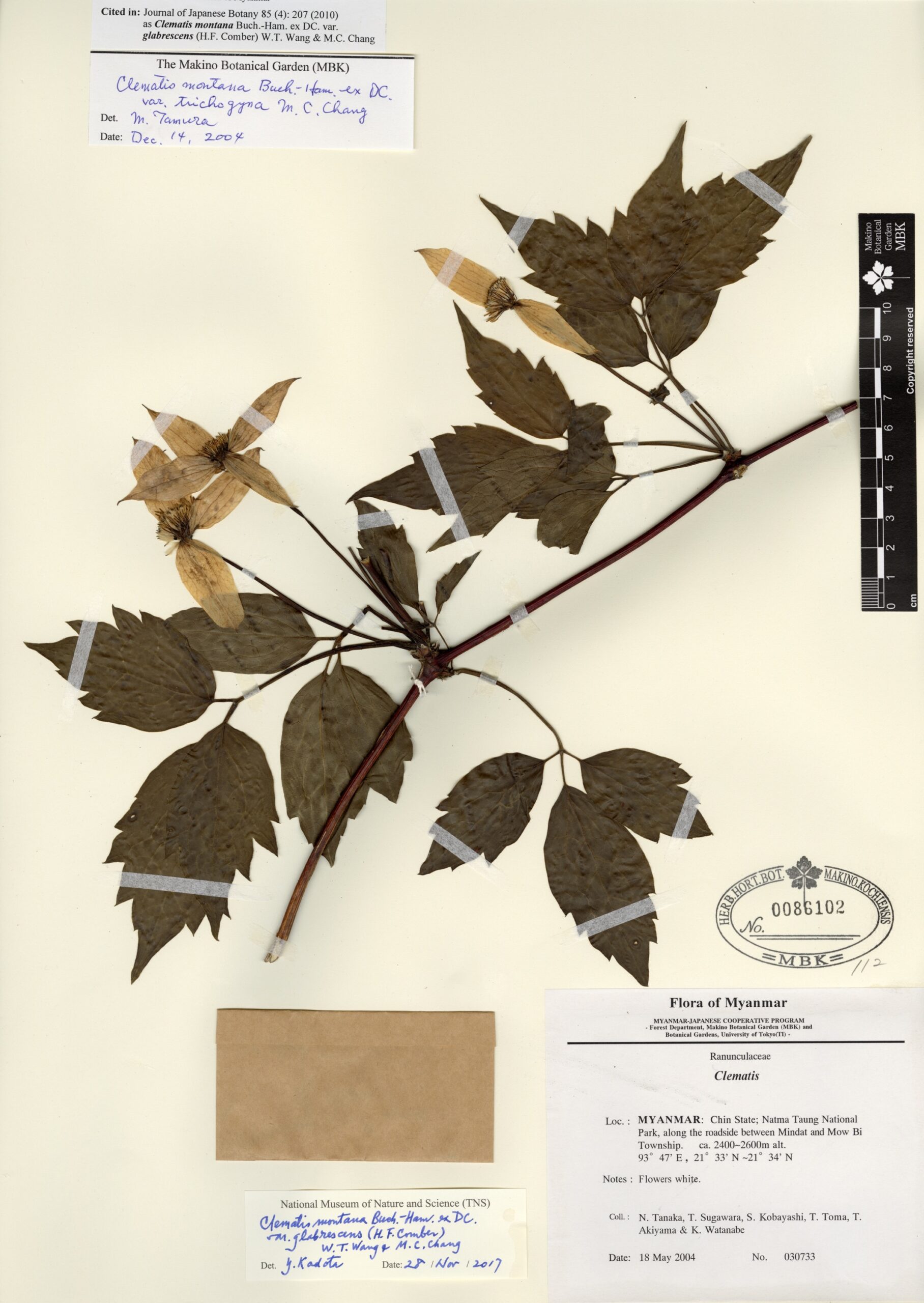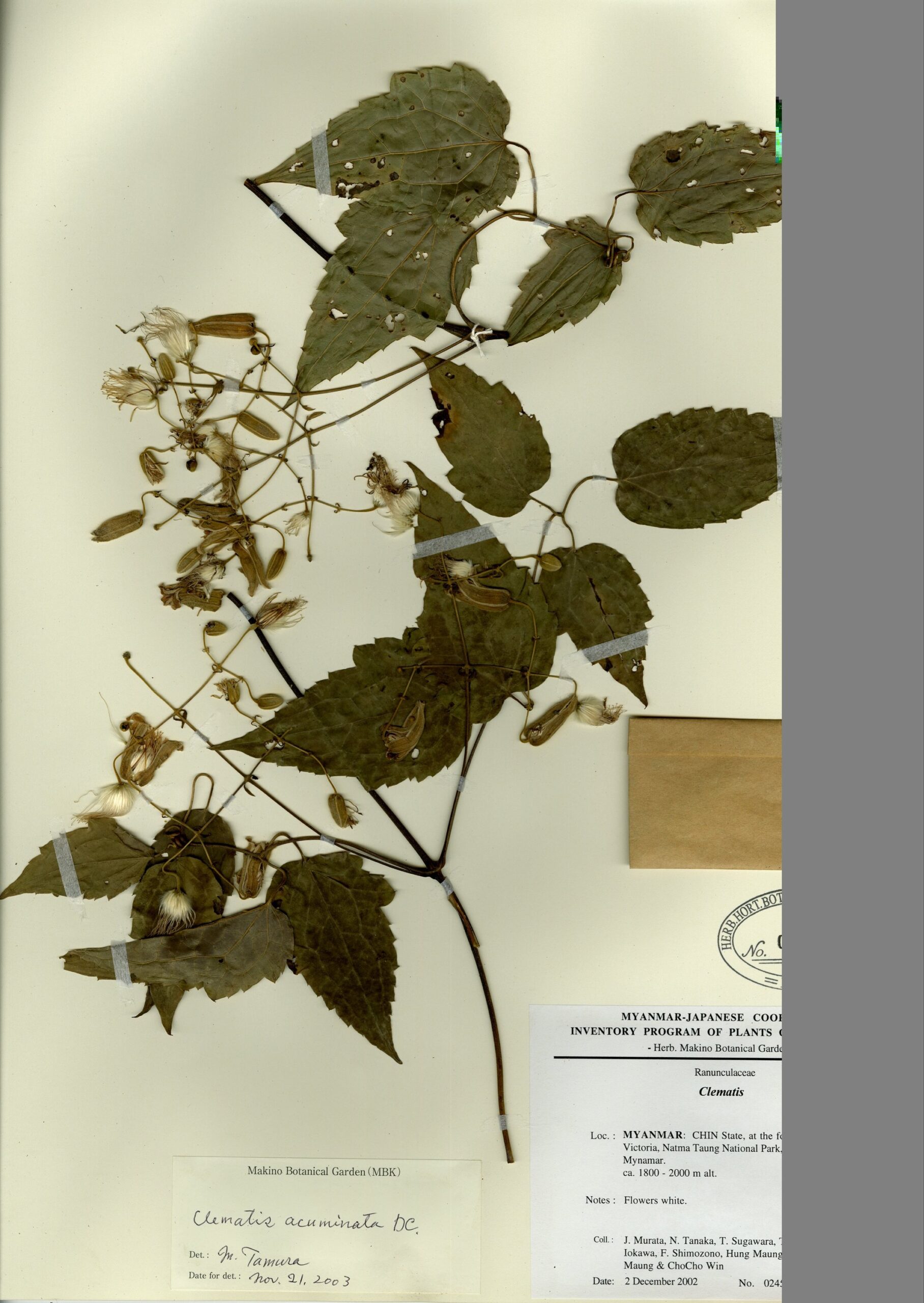 Ranunculaceae | Clematis siamensis Drumm. & Craib. | MYANMAR: CHIN State, at the foot of Mt. Victoria, Natma Taung National Park, Western Myanmar. | 2 December 2002 | J. Murata, N. Tanaka, T. Sugawara, T. Nemoto, Y. Iokawa, F. Shimozono, Hong Mang, Ling Shein Man & Cho Cho Win; | 024553 | 0058143 |