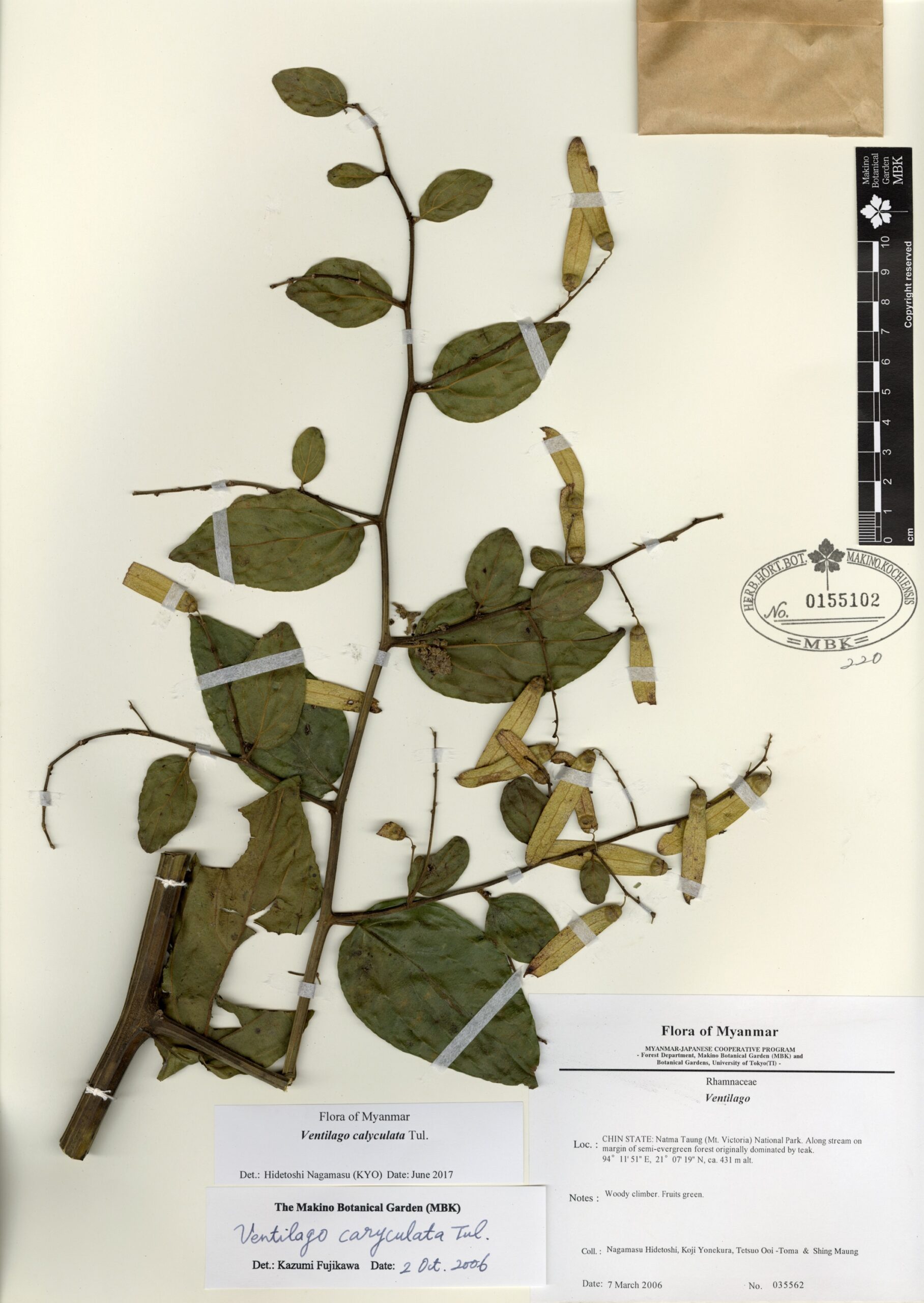Rhamnaceae | Ventilago calyculata Tul. | MYANMAR: CHIN STATE: Natma Taung (Mt. Victoria) National Park. Along stream on margin of semi-evergreen forest originally dominated by teak. | 7 March 2006 | Hidetoshi Nagamasu, Koji Yonekura, Tetsuo Ooi -Toma & Shing Maung; | 035562 | 0155102 |