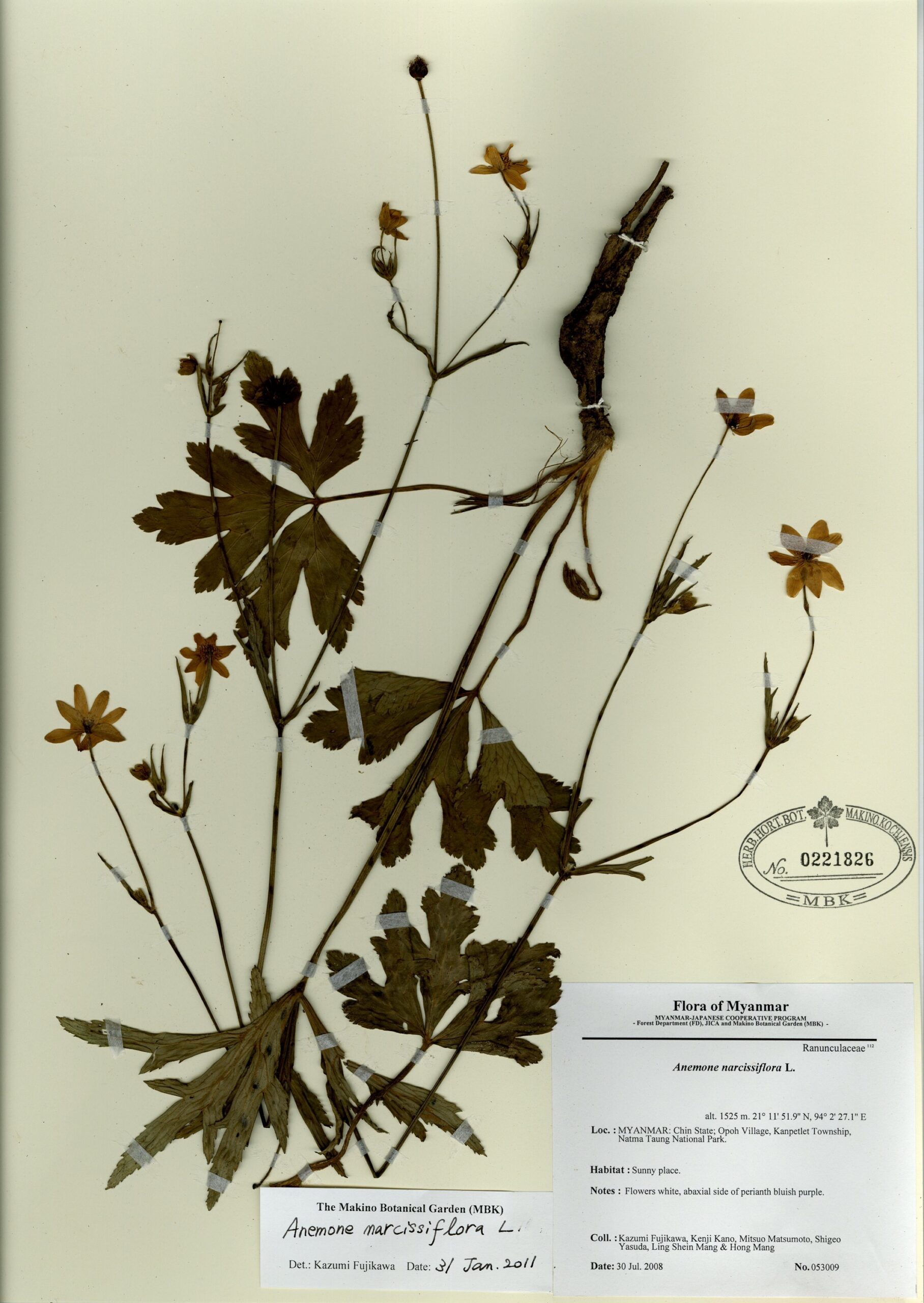 Ranunculaceae | Anemone demissa Hook.f. & Thomson | MYANMAR: CHIN State; Opoh Village, Kanpetlet Township, Natma Taung National Park. | 30 July 2008 | Kazumi Fujikawa, Kenji Kano, Mitsuo Matsumoto, Shigeo Yasuda, Ling Shein Man & Hong Mang; | 053009 | 0221826 |