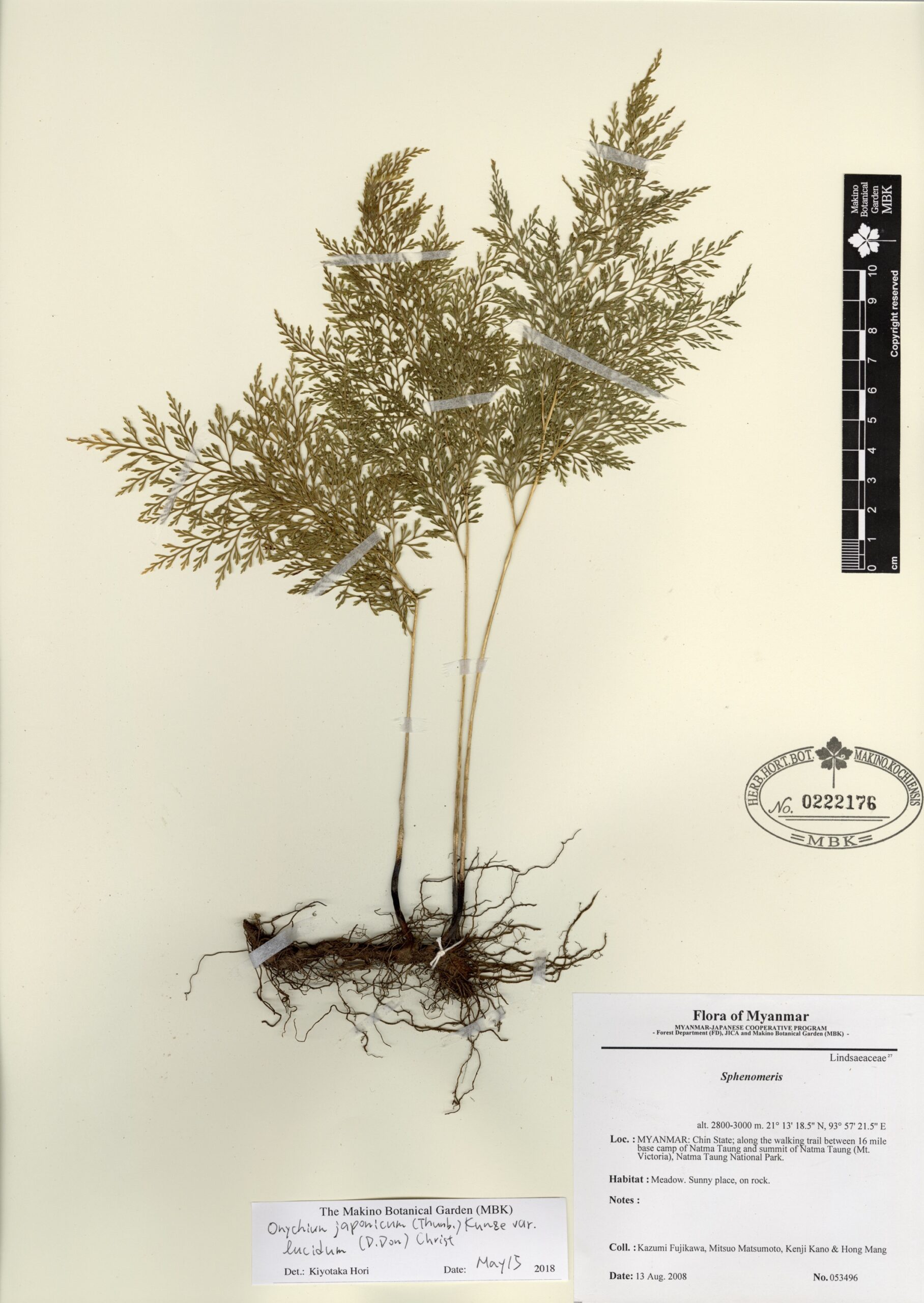 Pteridaceae | Onychium japonicum (Thunb.) Kunze var. lucidum (D.Don) Christ | MYANMAR: CHIN State; along the walking trail between 16 mile base camp of Natma Taung and summit of Natma Taung (Mt. Victoria), Natma Taung National Park. | 13 August 2008 | Kazumi Fujikawa, Mitsuo Matsumoto, Kenji Kano & Hong Mang; | 053496 | 0222176 |