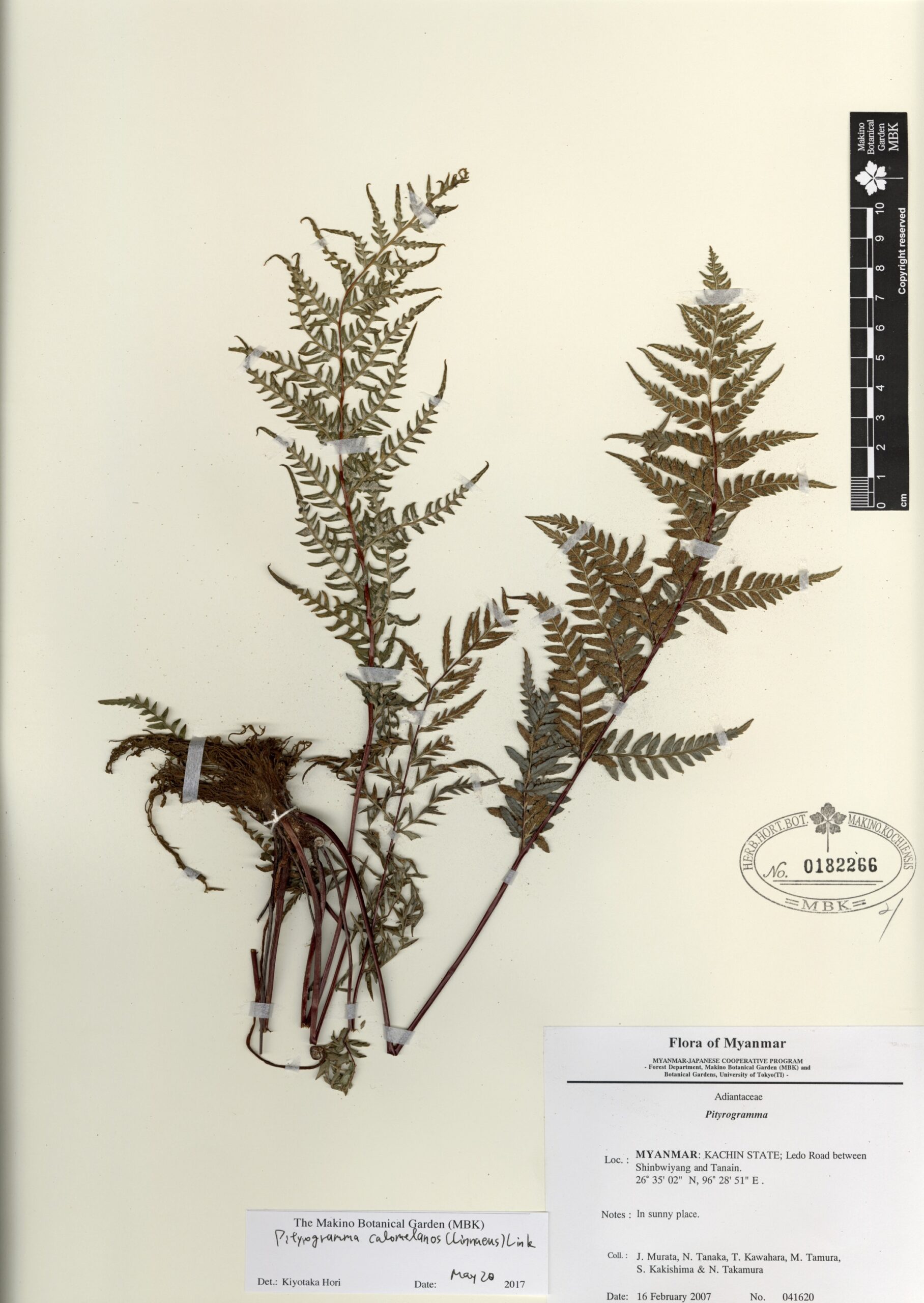Pteridaceae | Pityrogramma calomelanos (Linnaeus) Link | MYANMAR: KACHIN STATE; Ledo Road between Shinbwiyang and Tanain. | 16 February 2007 | J. Murata, N. Tanaka, T. Kawahara, M. Tamura, S. Kakishima & N. Takamura; |