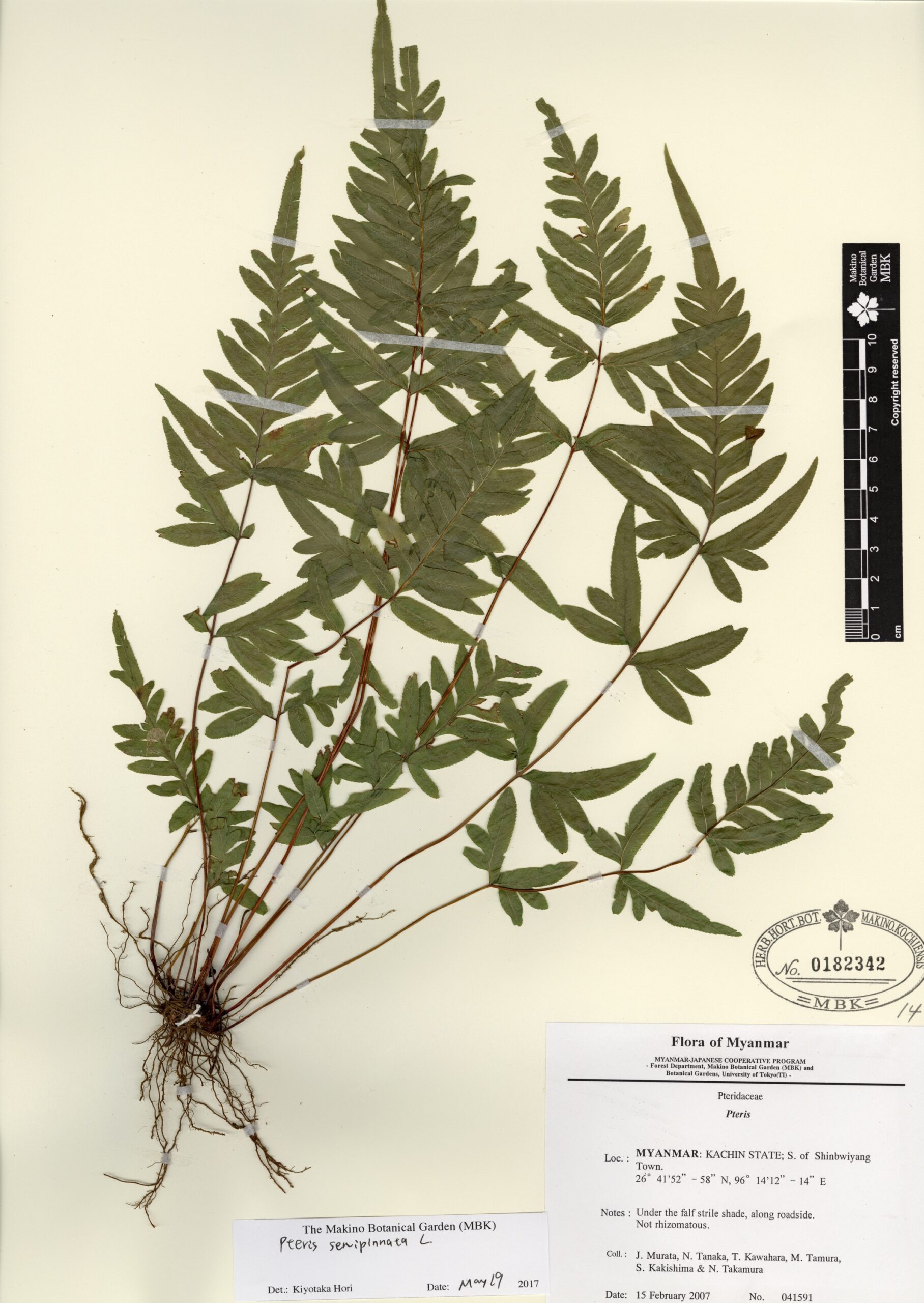 Pteridaceae | Pteris semipinata L. | MYANMAR: KACHIN STATE; S. of Shinbwiyang Town. | 15 February 2007 | J. Murata, N. Tanaka, T. Kawahara, M. Tamura, S. Kakishima & N. Takamura; |