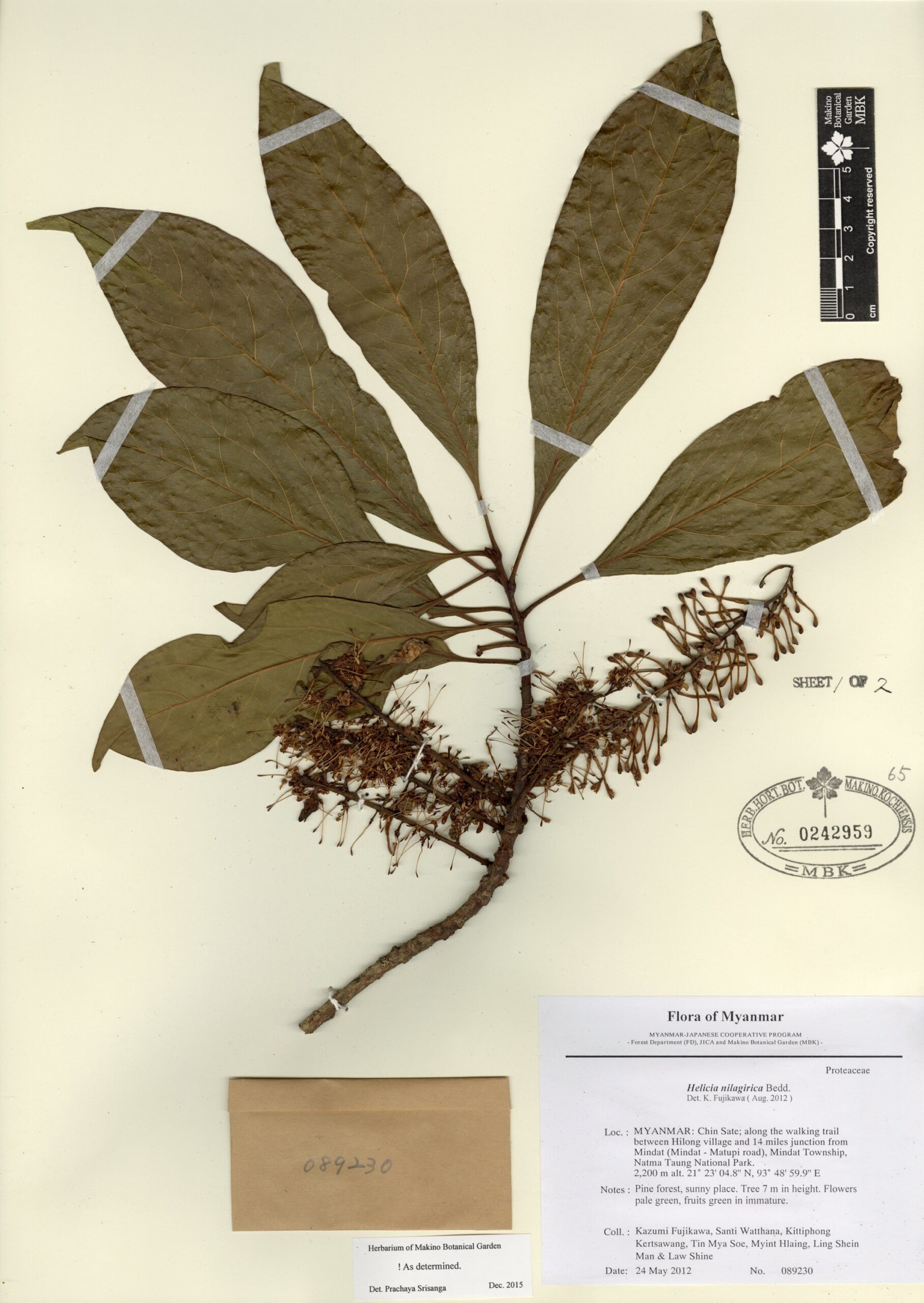 Proteaceae | Helicia nilagirica Bedd. | MYANMAR: Chin State; Road between Kampetlet and Mindat, ca. 6 miles from Kampetlet, Natmataung National Park. | 14 February 2007 | Kazumi Fujikawa, Nobuhito Kuroiwa, Ayako Maeda, Chika Mouri, Khin Myo Htwe, Ling Shing Maung, Hung Maung & Aung Thay; | 050041 | 0193313 |