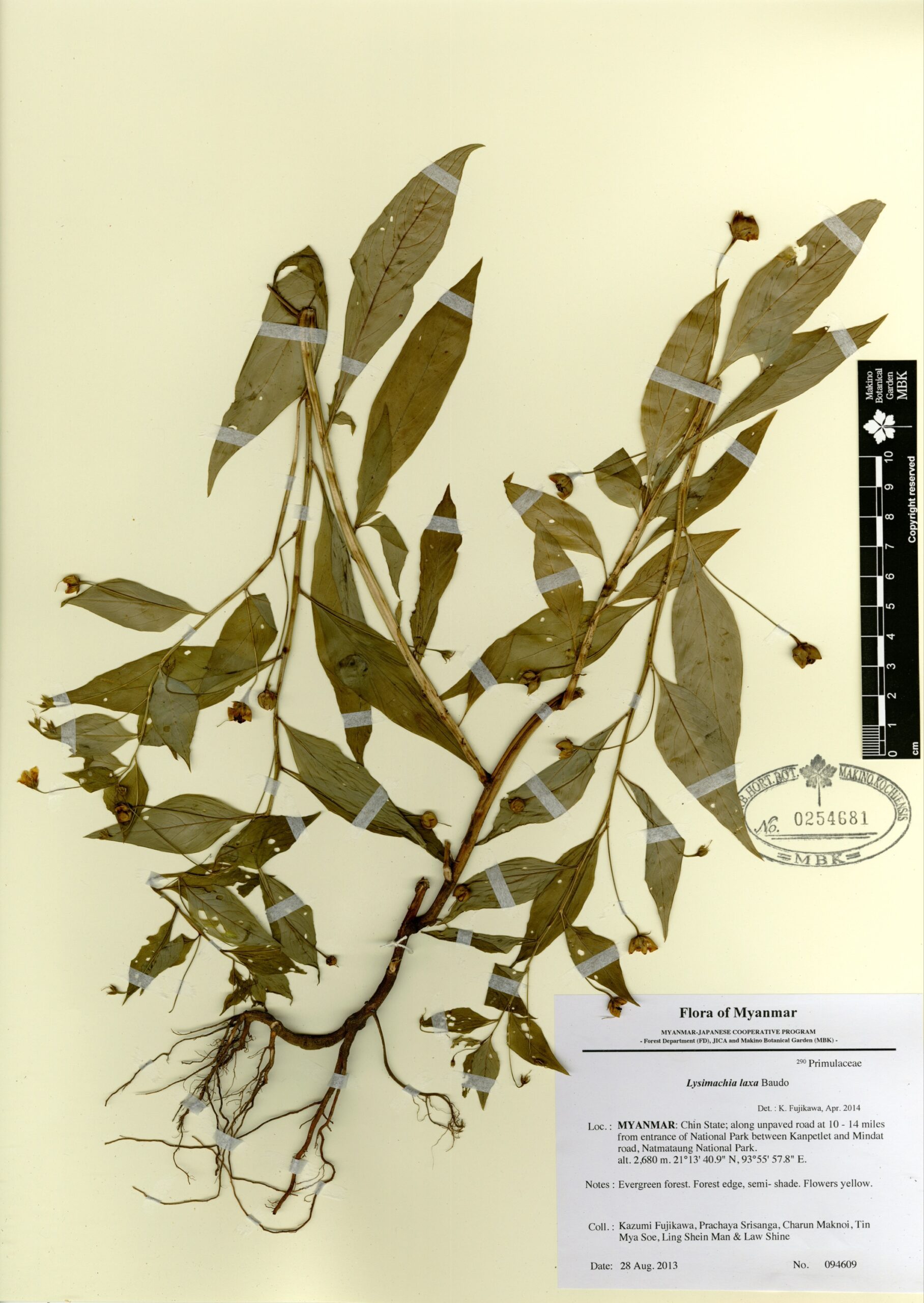 Primulaceae | Lysimachia laxa Baudo | MYANMAR: Chin State; along unpaved road at 10-14 miles from entrance of National Park between Kanpetlet and Mindat road, Natmataung National Park. | 28 August 2013 | Kazumi Fujikawa, Prachaya Srisanga, Charun Maknoi, Tin Mya Soe, Ling Shein Man & Law Shine; | 094609 | 0254681 |