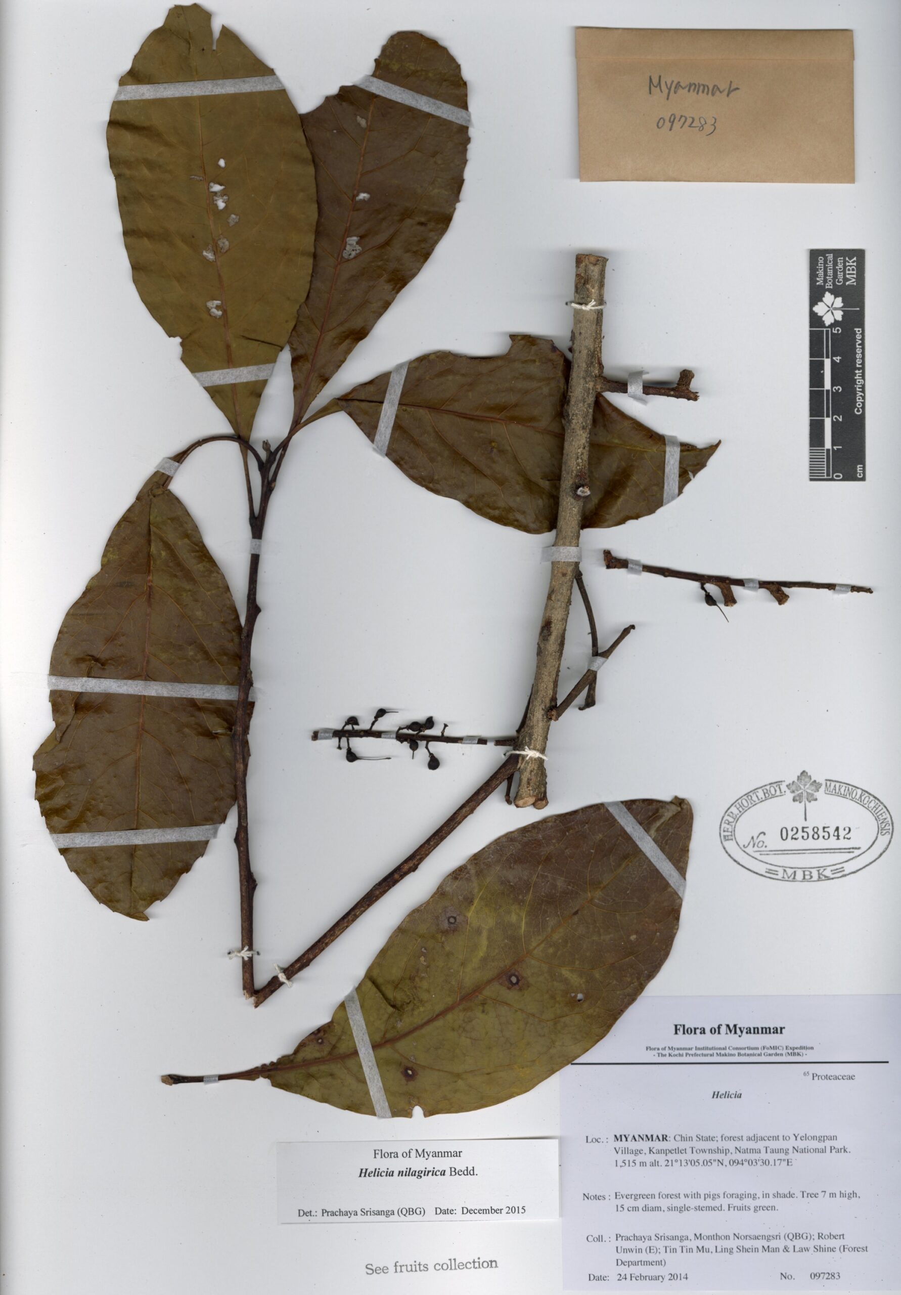 Proteaceae | Helicia nilagirica Bedd. | MYANMAR: Chin State; road between Kampetlet and Mindat, 6-8 miles from Kampetlet, Natmataung National Park. | 25 May 2007 | Nobuhito Kuroiwa, Ayako Maeda, Prachaya Srisanga (QSBG) & Ling Shing Maung; | 051276 | 0193602 |