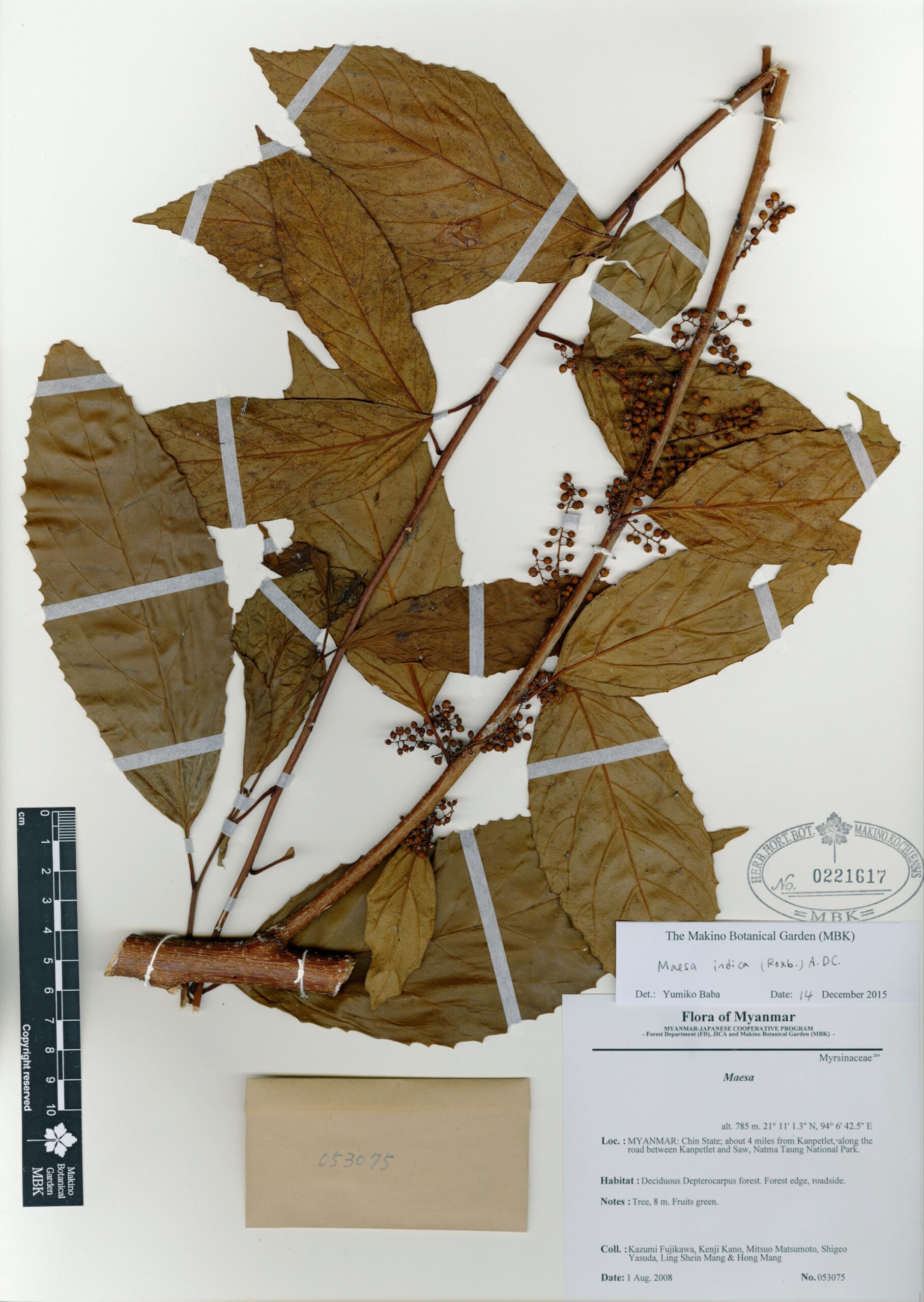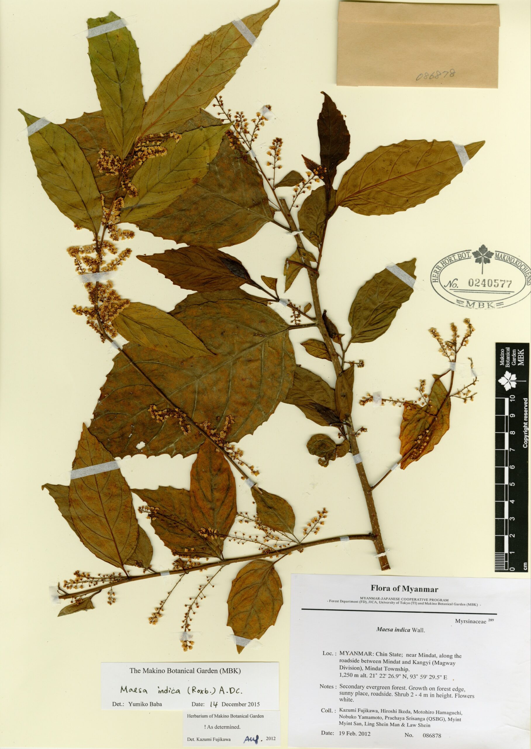 Primulaceae | Maesa indica (Roxb.) A. DC. | MYANMAR: CHIN State; about 4 miles from Kanpetlet, along the road between Kanpetlet and Saw, Natma Taung National Park. | 1 August 2008 | Kazumi Fujikawa, Kenji Kano, Mitsuo Matsumoto, Shigeo Yasuda, Ling Shein Man & Hong Mang; | 053075 | 0221617 |