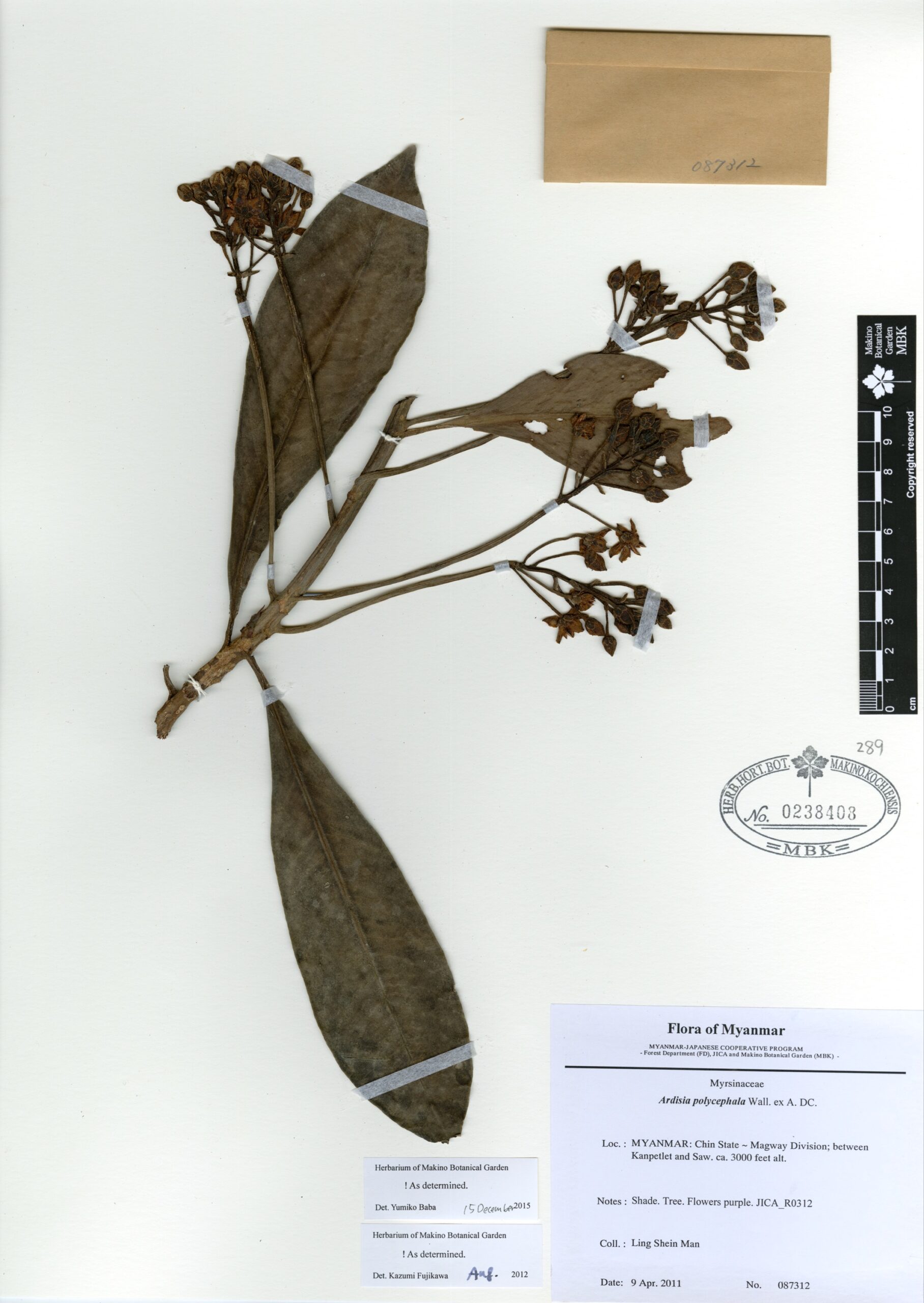 Primulaceae | Ardisia polycephala Wall. ex A. DC. | MYANMAR: Chin State - Magway Division; between Kanpetlet and Saw. | 9 April 2011 | Ling Shein Man; | 087312 | 0238408 |