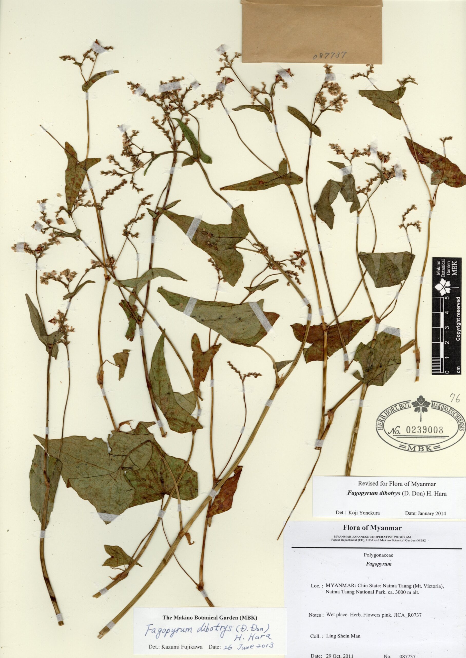 Polygonaceae | Fagopyrum dibotrys (D.Don) H.Hara | MYANMAR: Chin State: Natma Taung (Mt. Victoria), Natma Taung National Park. | 29 October 2011 | Ling Shein Man; | 087737 | 0239008 |