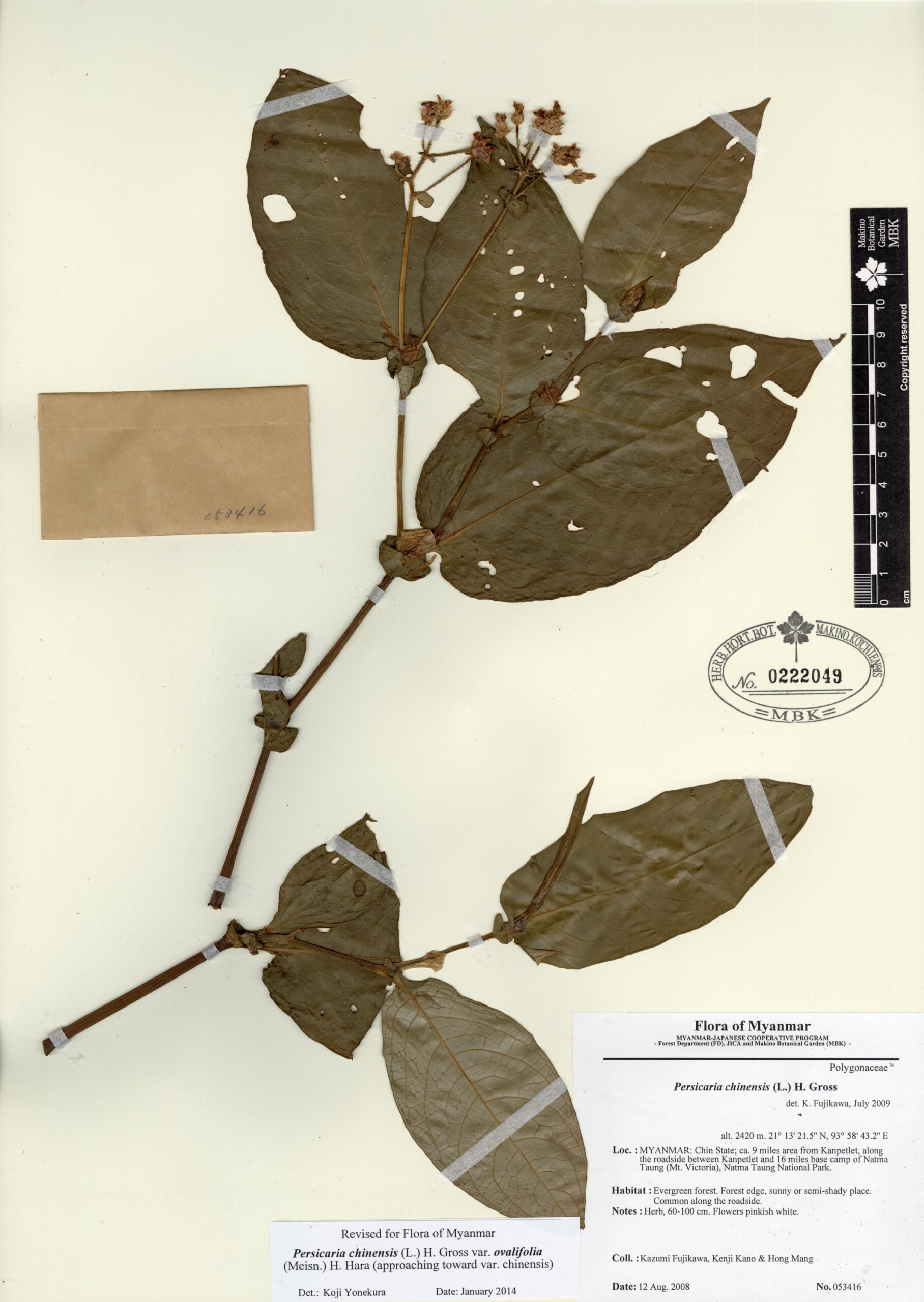 Polygonaceae | Persicaria strindbergii (J.Schuster) Yonek. | MYANMAR: CHIN State; 16 miles N from Mindat, Natma Taung National Park. | 24 June 2009 | Nobuyuki Tanaka & Tomohisa Yukawa; | 081130 | 0232252 |