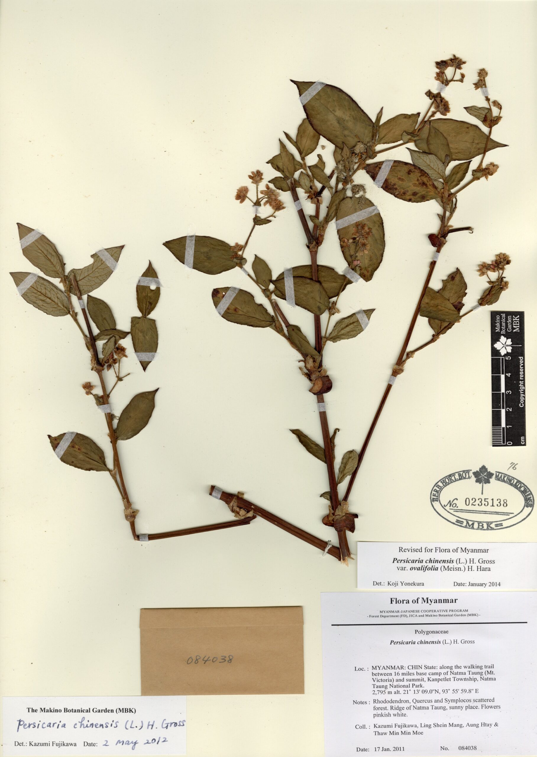 Polygonaceae | Persicaria chinensis (L.) H.Gross var. chinensis | MYANMAR: CHIN State; Natma Taung (Mt. Victoria) National Park, along the roadside near the Kampetlet guest house. | 21 May 2004 | N. Tanaka, T. Sugawara, S. Kobayashi, T. Toma, T. Akiyama & K. Watanabe; | 030979A | 0086100 |