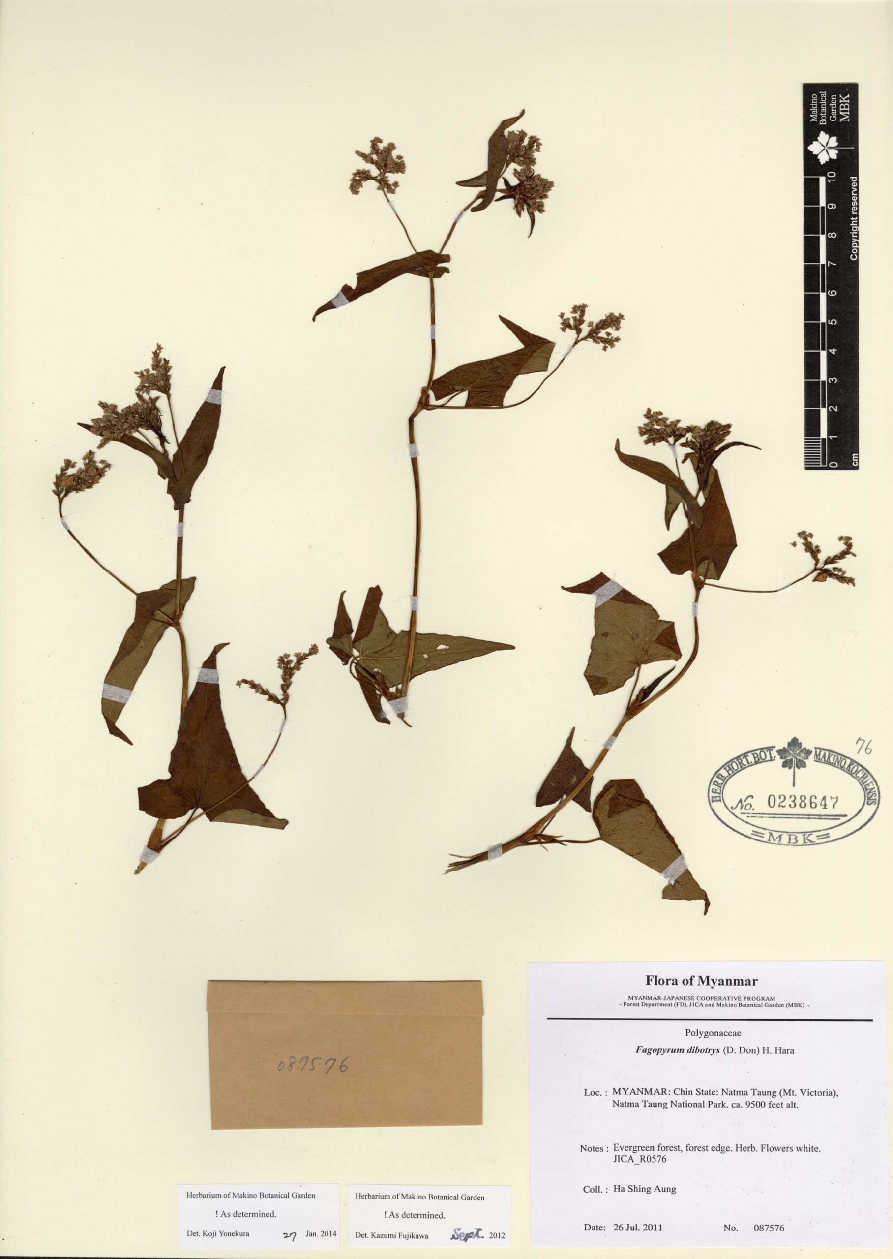 Polygonaceae | Fagopyrum dibotrys (D.Don) H.Hara | MYANMAR: CHIN State; in the pine forest, along the road to the entrance of the trail to the peak of Mt. Victoria, Natma Taung National Park. | 27 June 2009 | Nobuyuki Tanaka & Tomohisa Yukawa; | 081303 | 0232340 |