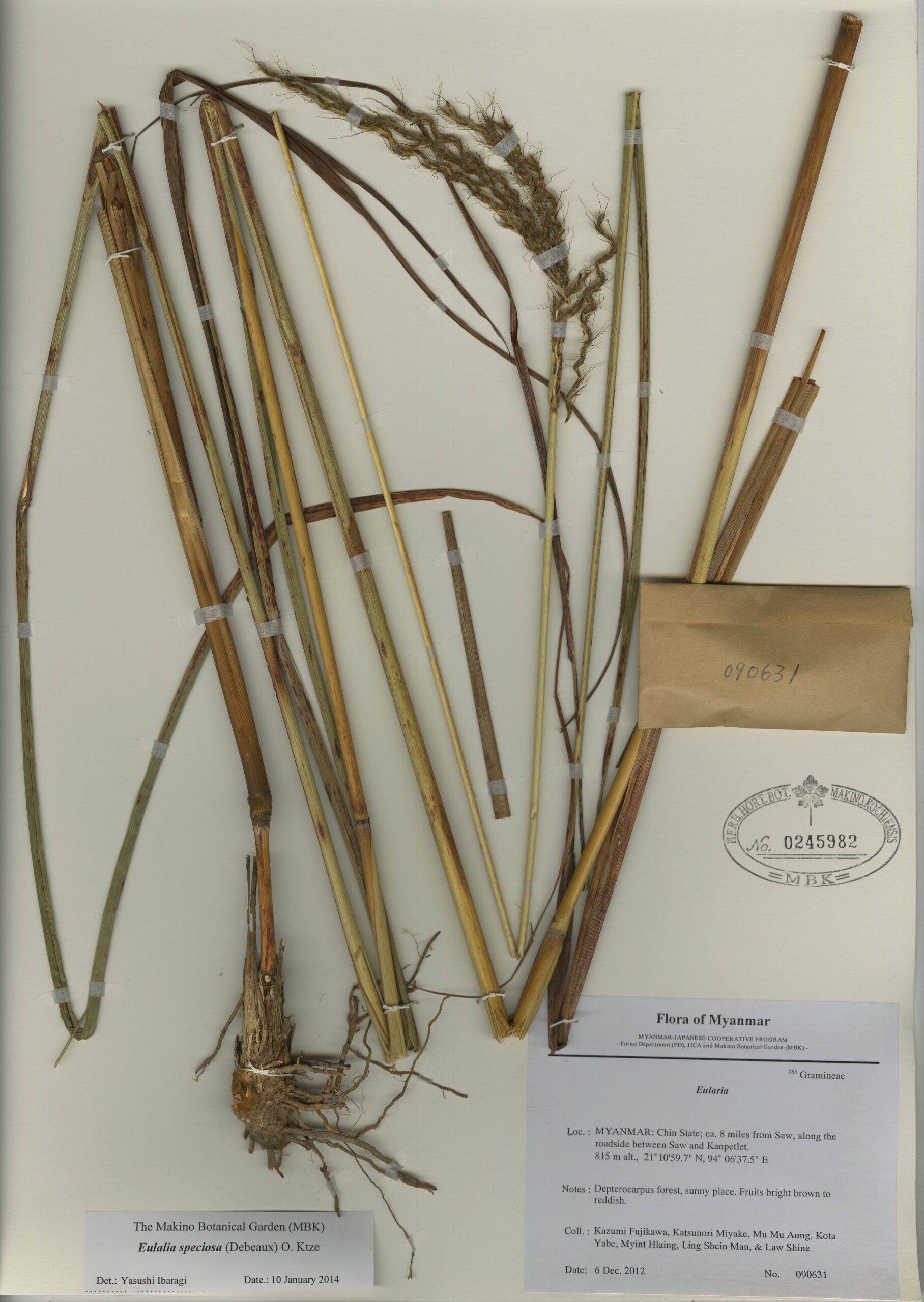 Poaceae | Eulalia speciosa (Debeaux) Kuntze | MYANMAR: Chin State; ca. 8 miles from Saw, along the roadside between Saw and Kanpetlet. | 6 December 2012 | Kazumi Fujikawa, Katsunori Miyake, Mu Mu Aung, Kota Yabe, Myint Hlaing, Ling Shein Man & Law Shine; | 090631 | 0245982 |