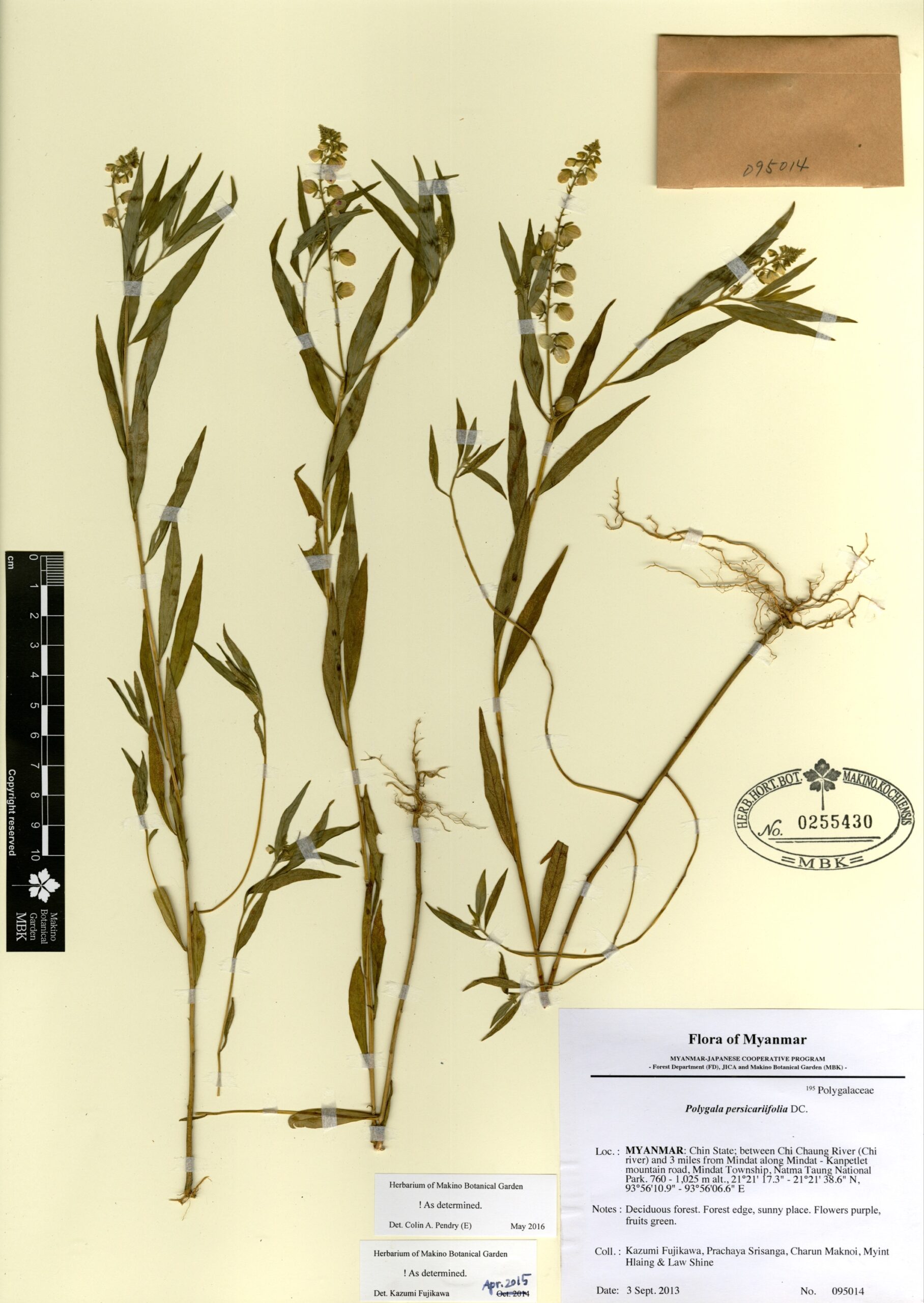 Polygalaceae | Polygala persicariifolia DC. | MYANMAR: Chin State; between Chi Chaung River (Chi river) and 3 miles from Mindat along Mindat - Kanpetlet mountain road, Mindat Township, Natma Taung National Park. | 3 September 2013 | Kazumi Fujikawa, Prachaya Srisanga, Charun Maknoi, Myint Hlaing & Law Shine; | 095014 | 0255430 |