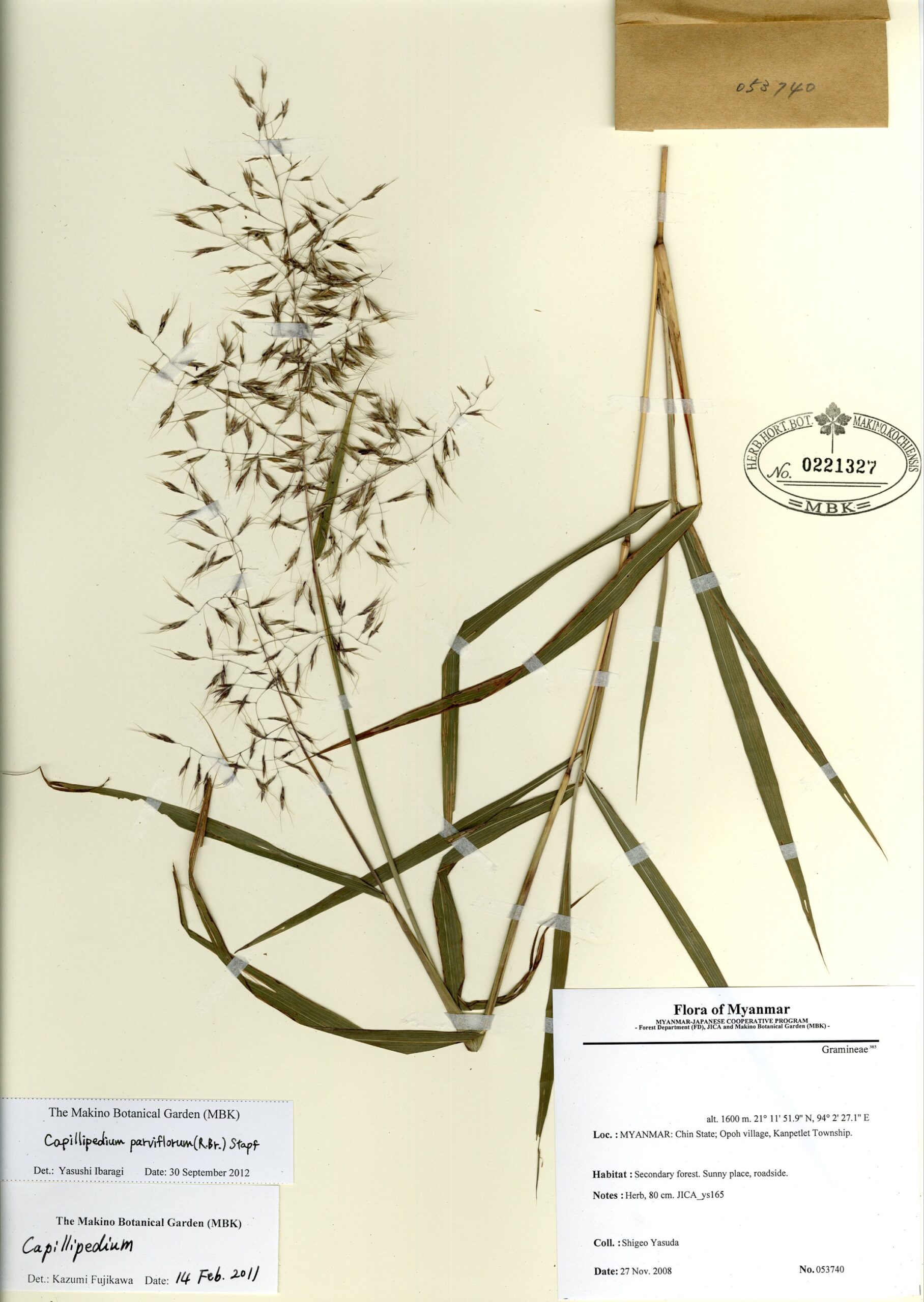 Poaceae | Capillipedium assimile (Steud.) A. Camus | MYANMAR: CHIN State; Opoh village, Kanpetlet Township. | 27 November 2008 | Shigeo Yasuda; | 053740 | 0221327 |