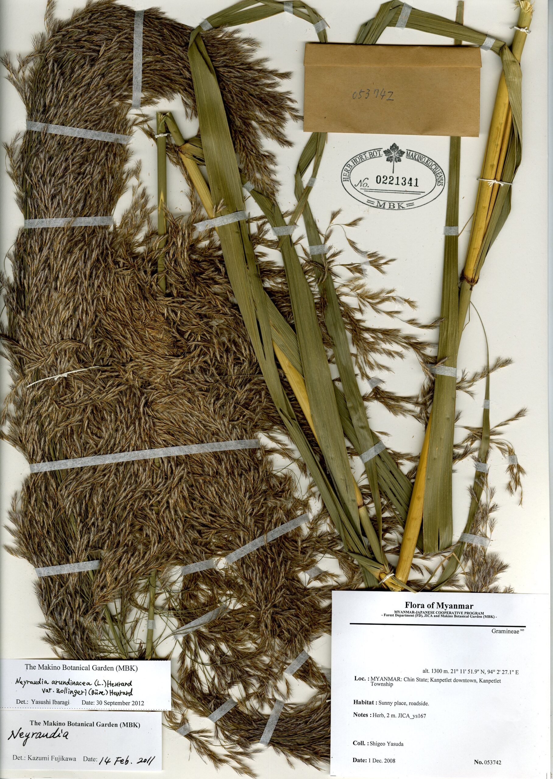 Poaceae | Microstegium vagans (Nees ex Steud.) A. Camus | MYANMAR: Rakhine State: along the roadside, between Pyat and Taungok, at the forest edge of the Rakhaine Yoma. | 10 December 2008 | Nobuyuki Tanaka, Takashi Sugawara, Akiyo Naiki & Yu Ito; | 080878 | 0215977 |