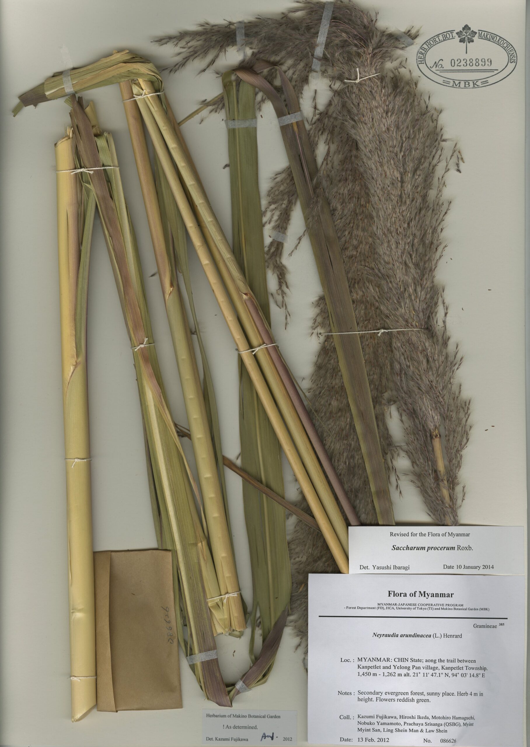 Poaceae | Erianthus procerus (Roxb.) Raizada | MYANMAR: CHIN State; along the trail between Kanpetlet and Yelong Pan village, Kanpetlet Township. | 13 February 2012 | Kazumi Fujikawa, Hiroshi Ikeda, Motohiro Hamaguchi, Nobuko Yamamoto, Prachaya Srisanga (QSBG), Myint Myint San, Ling Shein Man & Law Shein; | 086626 | 0238899 |