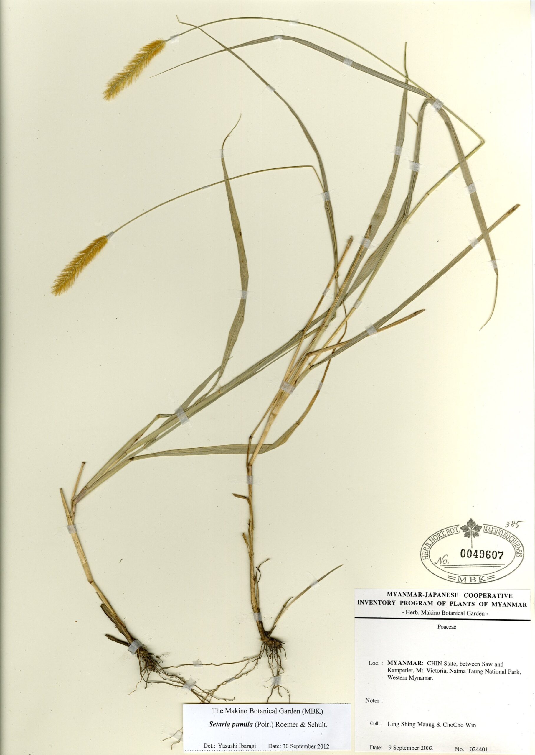 Poaceae | Setaria pumila (Poir.) Roemer et Schult. | MYANMAR: CHIN State, between Saw and Kampetlet, Mt. Victoria, Natma Taung National Park, Western Myanmar. | 9 September 2002 | Ling Shein Man & Cho Cho Win; | 024401 | 0049607 |