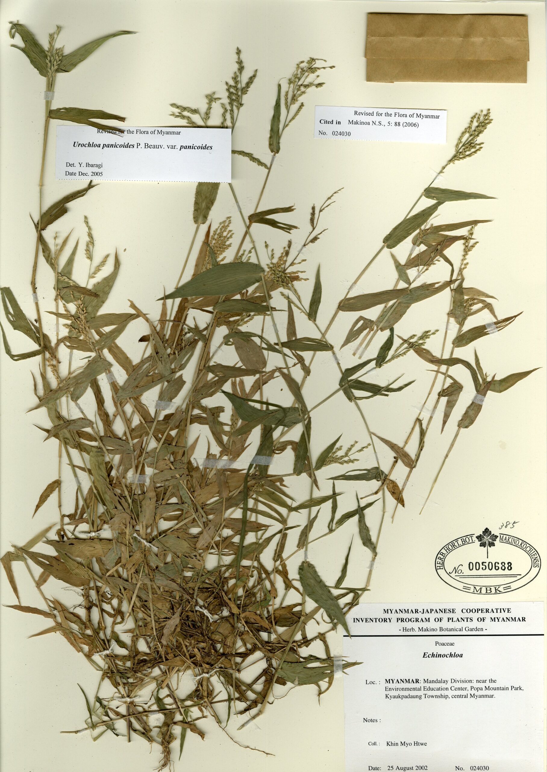 Poaceae | Urochloa panicoides P. Beauv. var. panicoides | MYANMAR: Mandalay Division: near the Environmental Education Center, Popa Mountain Park, Kyaukpadaung Township, central Myanmar. | 25 August 2002 | Khin Myo Htwe; | 024030 | 0050688 |