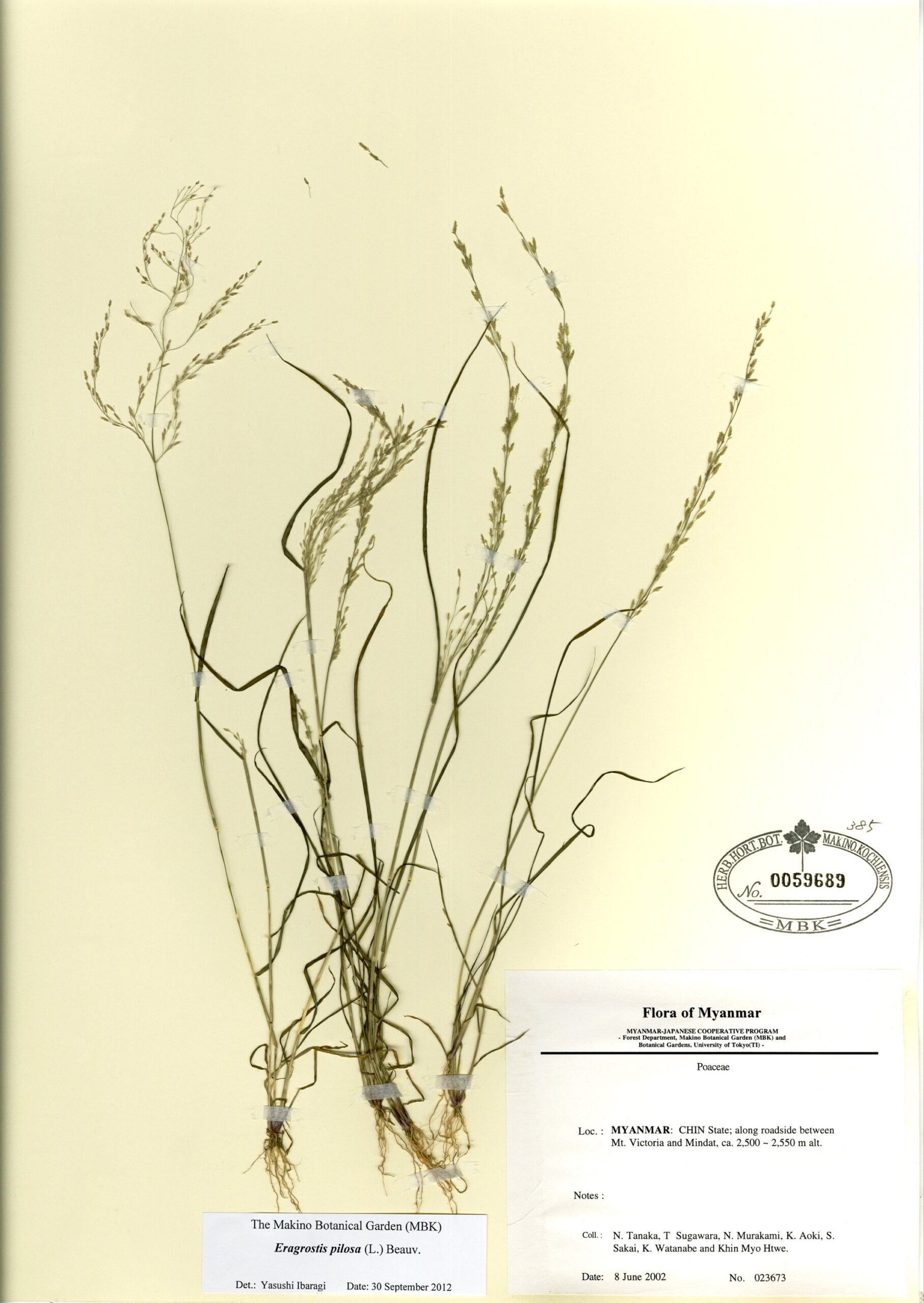 Poaceae | Eragrostis pilosa (L.) Beauv. | MYANMAR: CHIN State; along roadside between Mt. Victoria and Mindat. | 8 June 2002 | N. Tanaka, T. Sugawara, N. Murakami, K. Aoki, S. Sakai, K. Watanabe & Khin Myo Htwe; | 023673 | 0059689 |