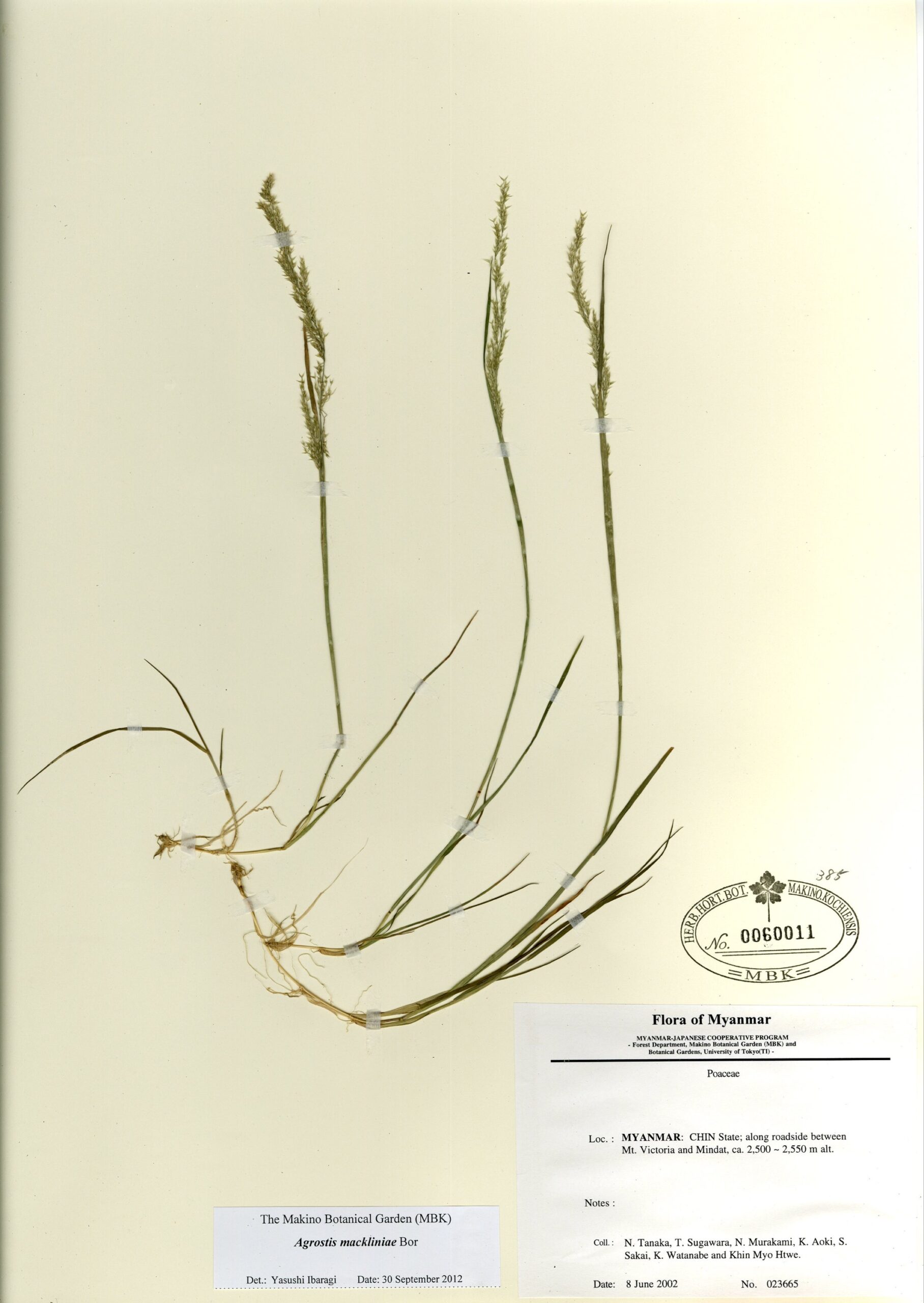 Poaceae | Agrostis mackliniae Bor | MYANMAR: CHIN State; along roadside between Mt. Victoria and Mindat. | 8 June 2002 | N. Tanaka, T. Sugawara, N. Murakami, K. Aoki, S. Sakai, K. Watanabe & Khin Myo Htwe; | 023665 | 0060011 |