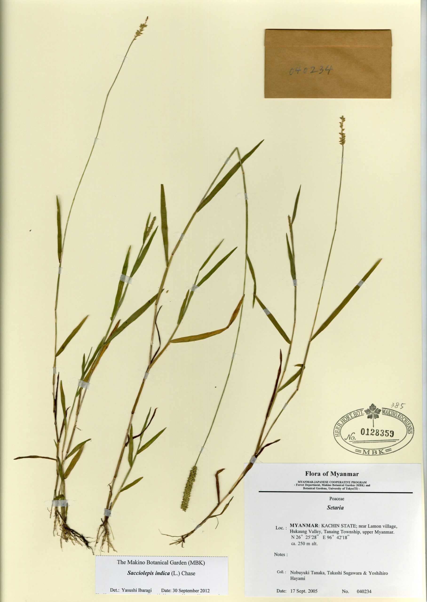 Poaceae | Sacciolepis indica (L.) Chase | MYANMAR: KACHIN STATE; near Lamon village, Hukaung Valley, Tanaing Township, upper Myanmar. | 17 September 2005 | Nobuyuki Tanaka, Takashi Sugawara & Yoshihiro Hayami; | 040234 | 0128359 |