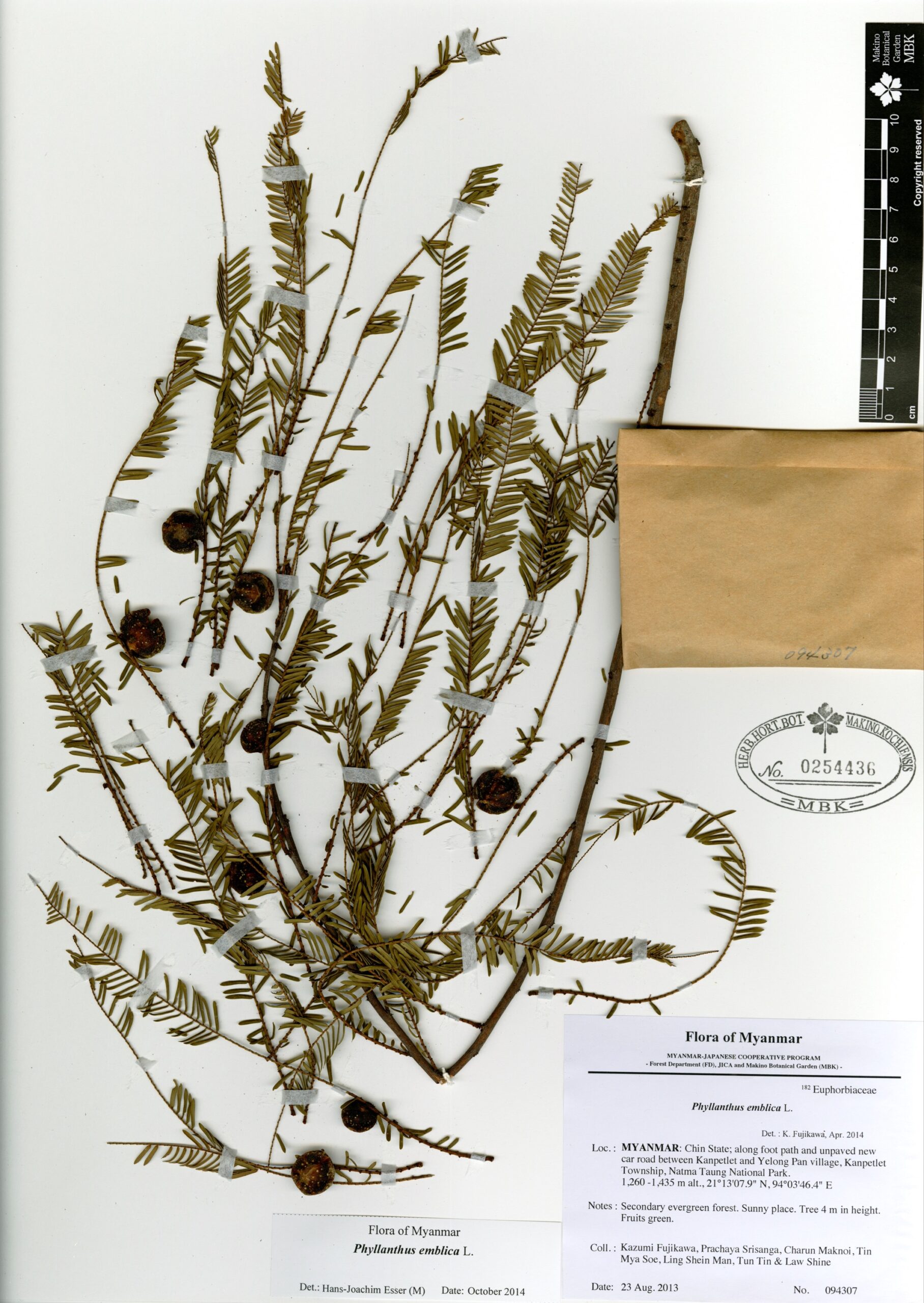 Phyllanthaceae | Phyllanthus emblica L. | MYANMAR: Chin State; along foot path and unpaved new car road between Kanpetlet and Yelong Pan village, Kanpetlet Township, Natma Taung National Park. | 23 August 2013 | Kazumi Fujikawa, Prachaya Srisanga, Charun Maknoi, Tin Mya Soe, Ling Shein Man, Tun Tin & Law Shine; | 094307 | 0254436 |