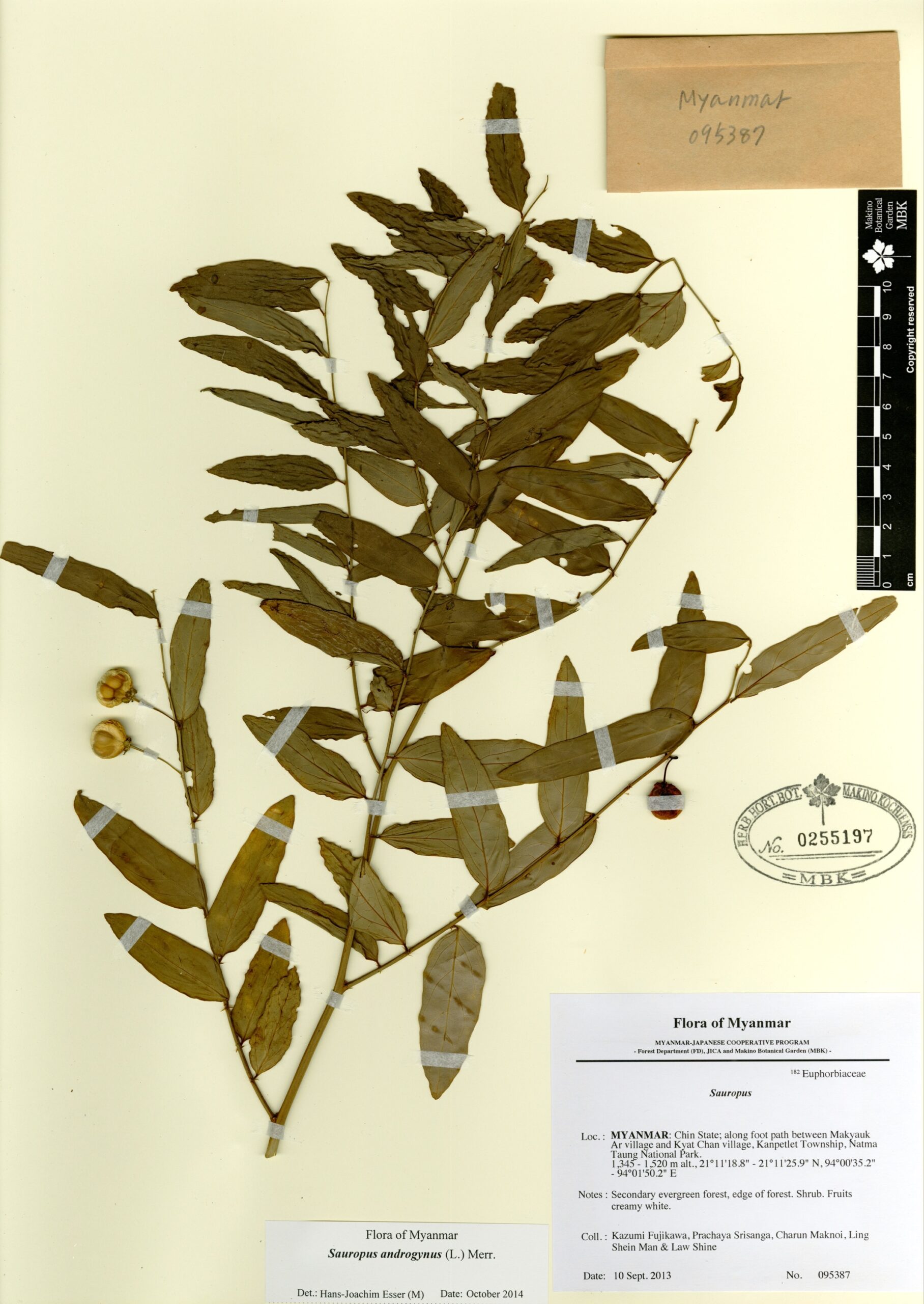 Phyllanthaceae | Sauropus androgynus (L.) Merr. | MYANMAR: Chin State; along foot path between Makyauk Ar village and Kyat Chan village, Kanpetlet Township, Natma Taung National Park. | 10 September 2013 | Kazumi Fujikawa, Prachaya Srisanga, Charun Maknoi, Ling Shein Man & Law Shine; | 095387 | 0255197 |