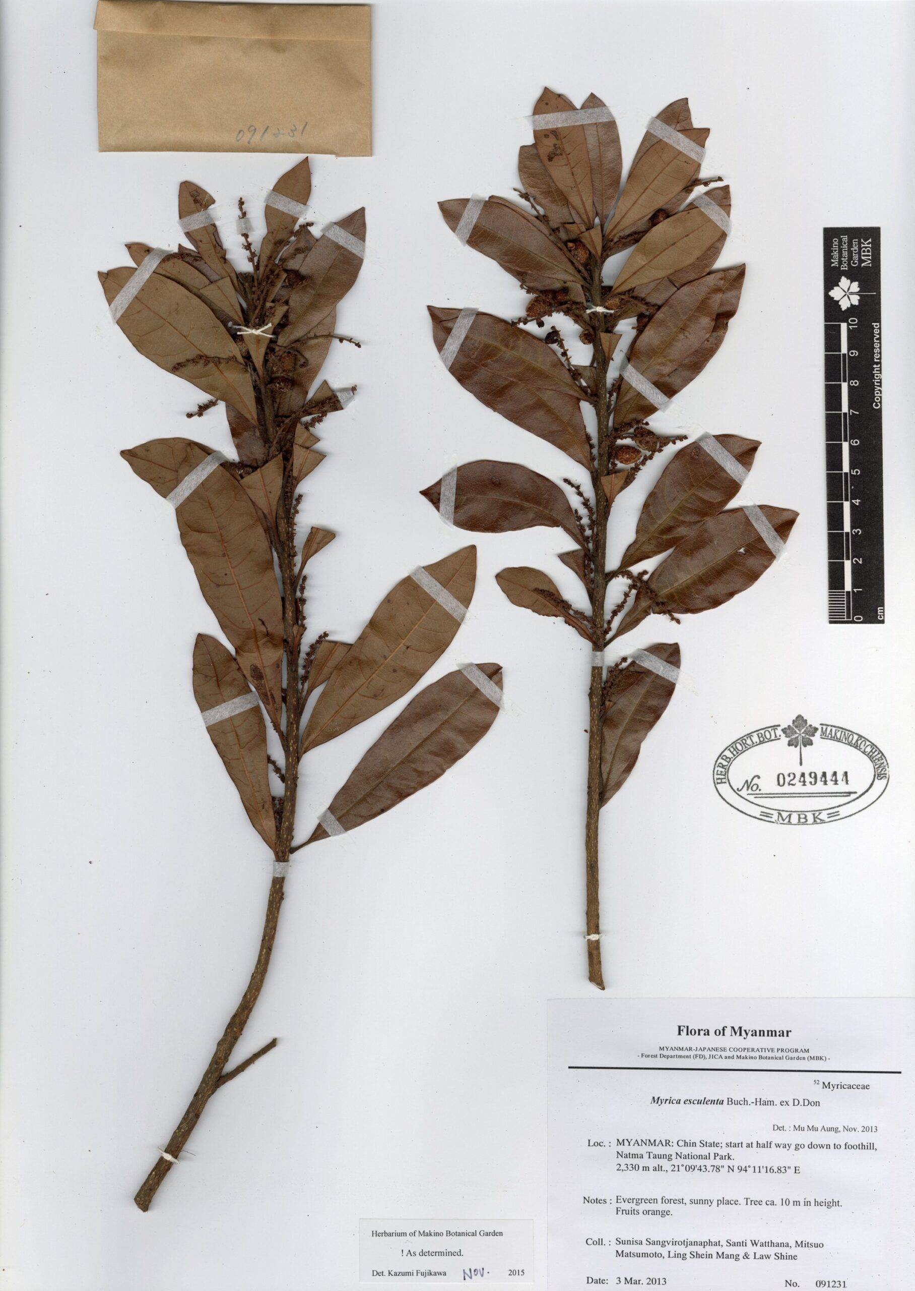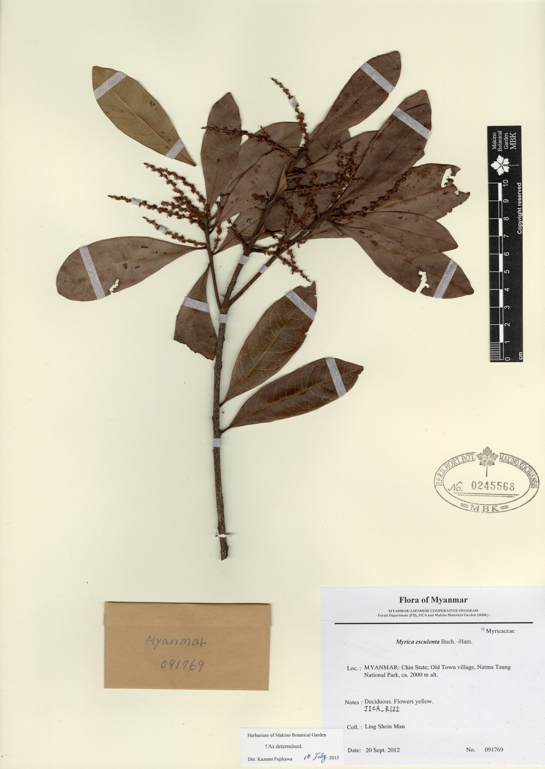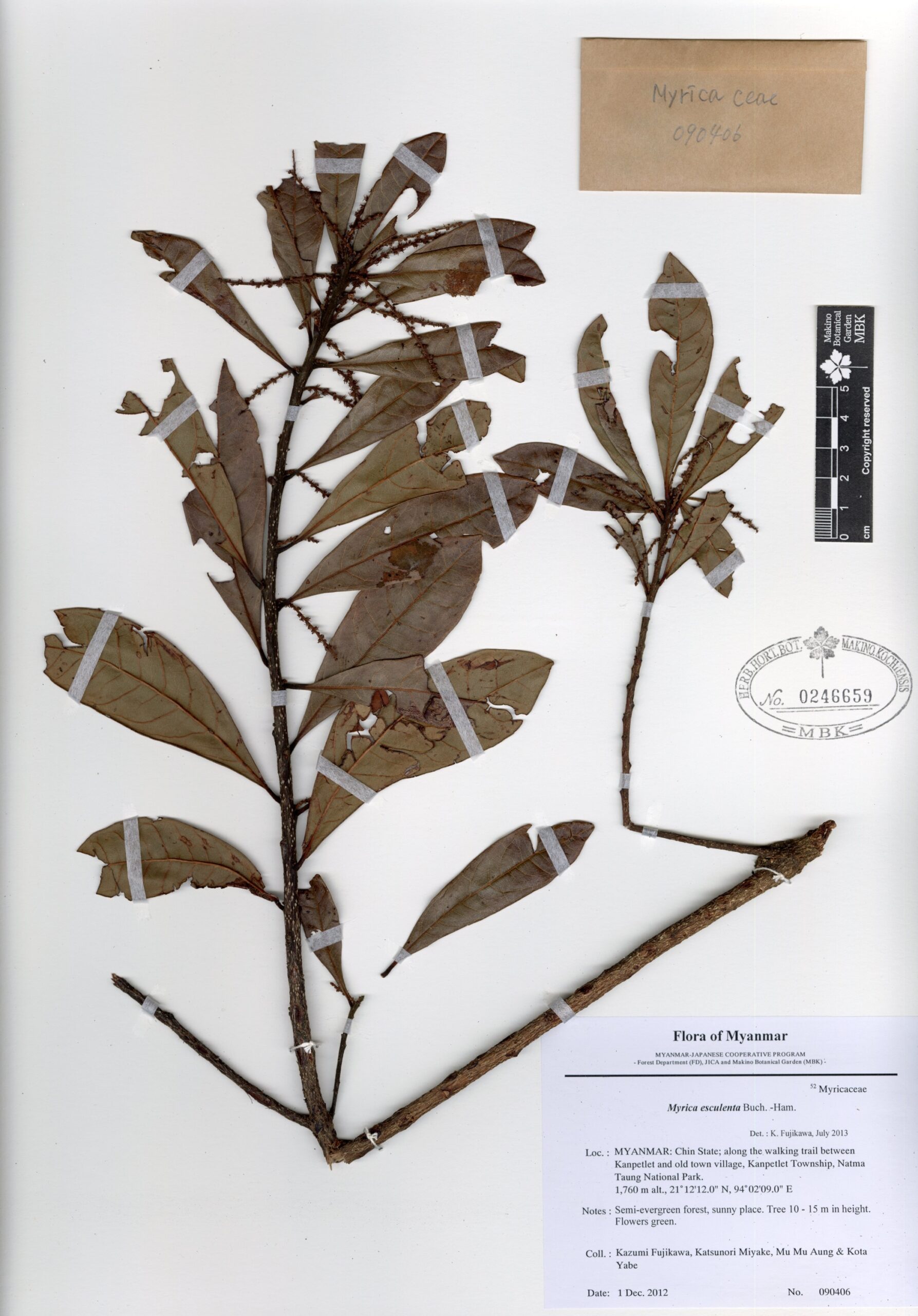 Myricaceae | Myrica esculenta Buch.-Ham. ex D. Don | MYANMAR: Chin State; along the walking trail between Kanpetlet and old town village, Kanpetlet Township, Natma Taung National Park. | 1 December 2012 | Kazumi Fujikawa, Katsunori Miyake, Mu Mu Aung & Kota Yabe; | 090406 | 0246659 |