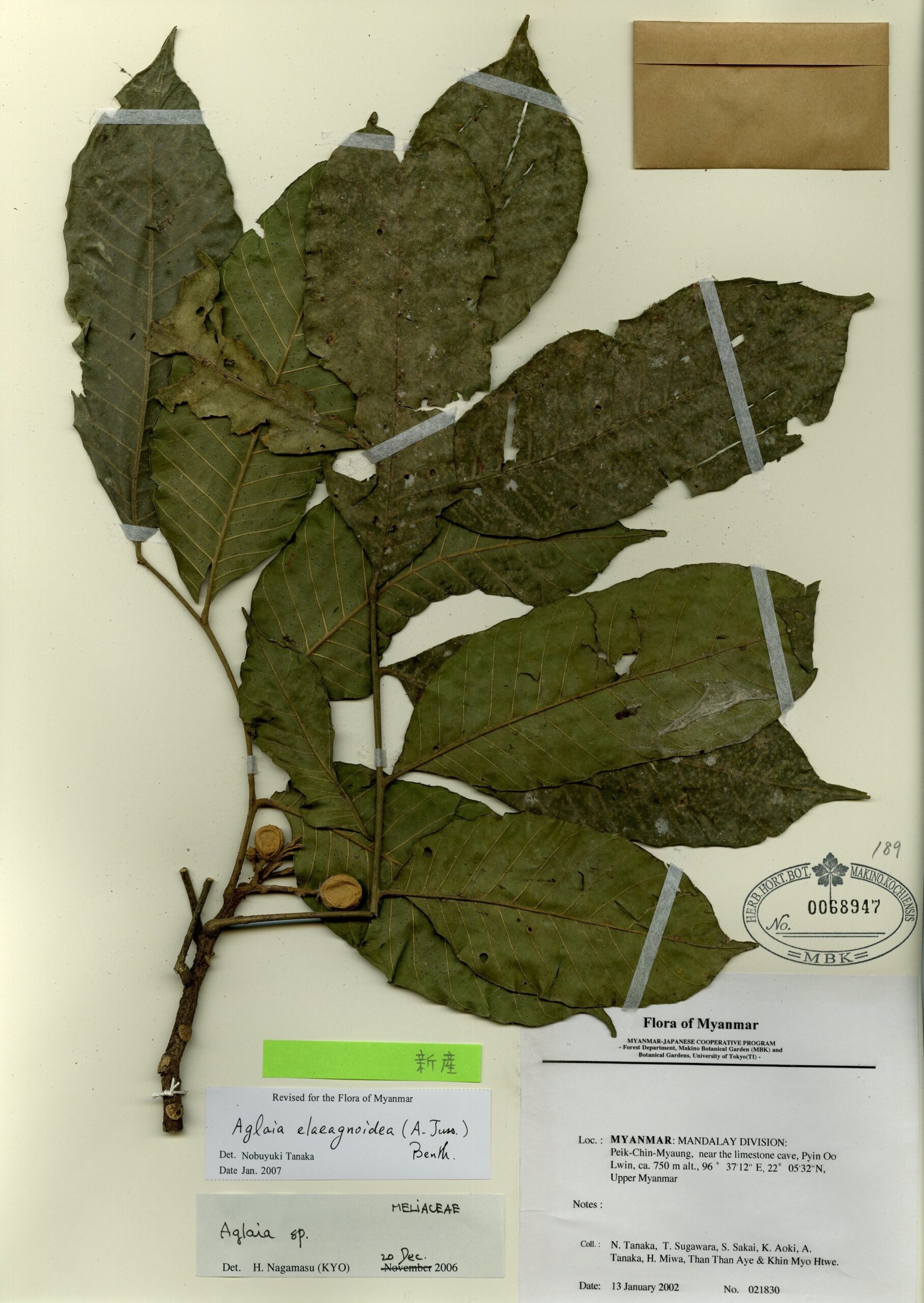 Meliaceae | Aglaia elaeagnoidea (A. Juss.) Benth. | MYANMAR: MANDALAY DIVISION: Peik-Chin-Myaung, near the limestone cave, Pyin Oo Lwin, Upper Myanmar. | 13 January 2002 | N. Tanaka, T. Sugawara, S. Sakai, K. Aoki, A. Tanaka, H. Miwa, Than Than Aye & Khin Myo Htwe.; | 021830 | 0068947 |