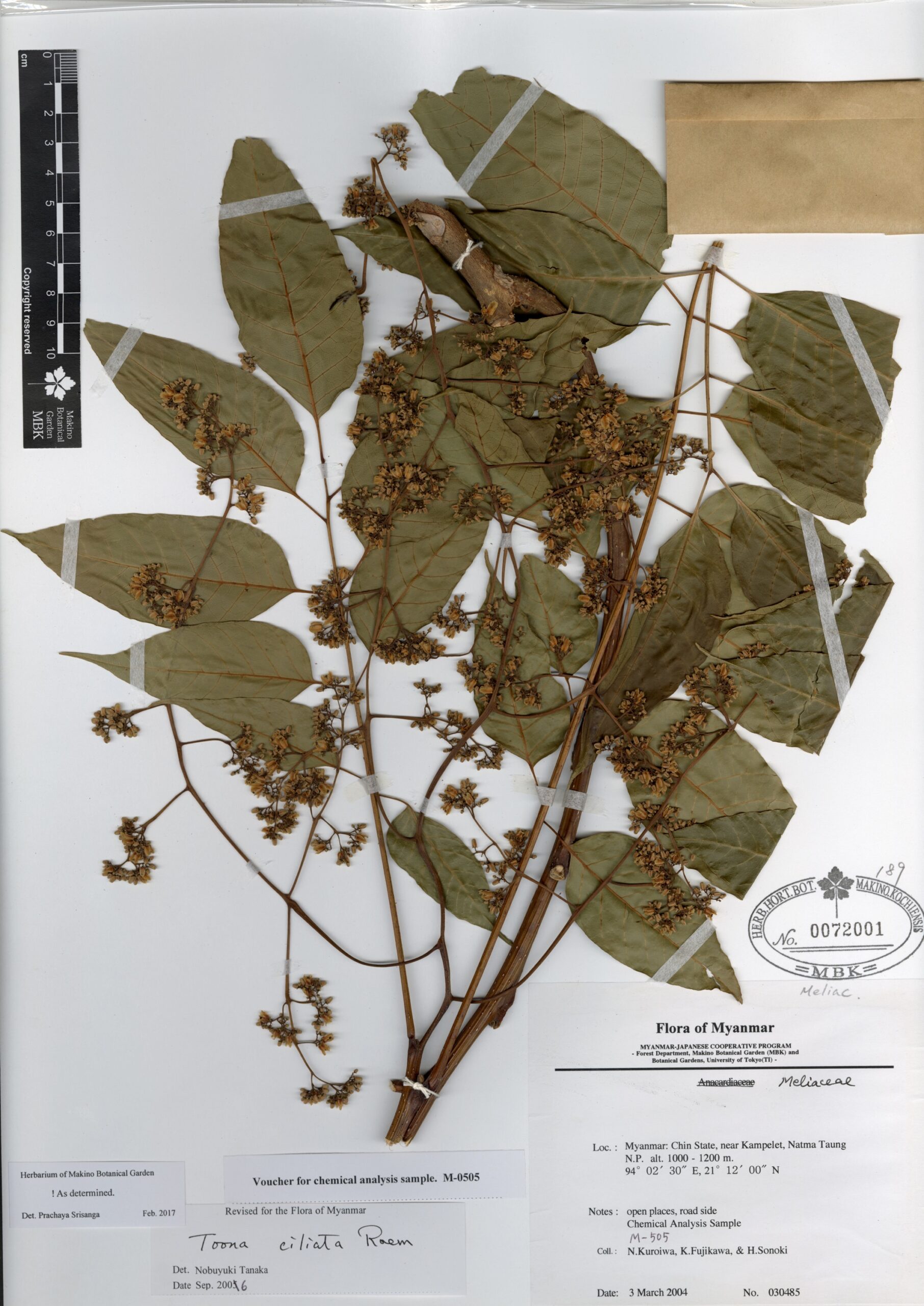 Meliaceae | Toona ciliata M. Roem. | MYANMAR: Chin State, near Kampelet, Natma Taung N.P. | 3 March 2004 | N. Kuroiwa, K. Fujikawa, & H. Sonoki; | 030485 | 0072001 |