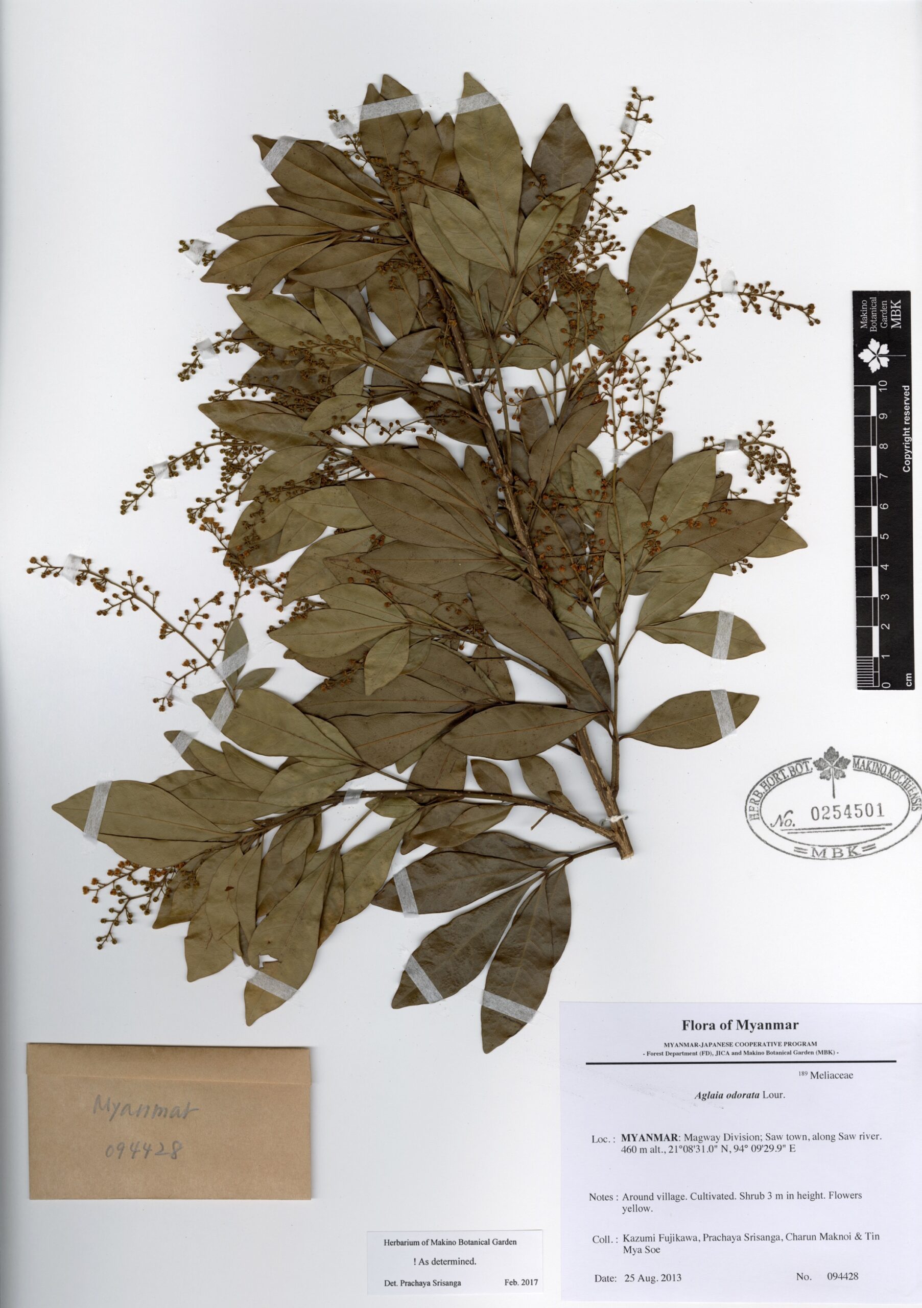 Meliaceae | Aglaia odorata Lour. | MYANMAR: Magway Division; Saw town, along Saw river. | 25 August 2013 | Kazumi Fujikawa, Prachaya Srisanga, Charun Maknoi & Tin Mya Soe; | 094428 | 0254501 |