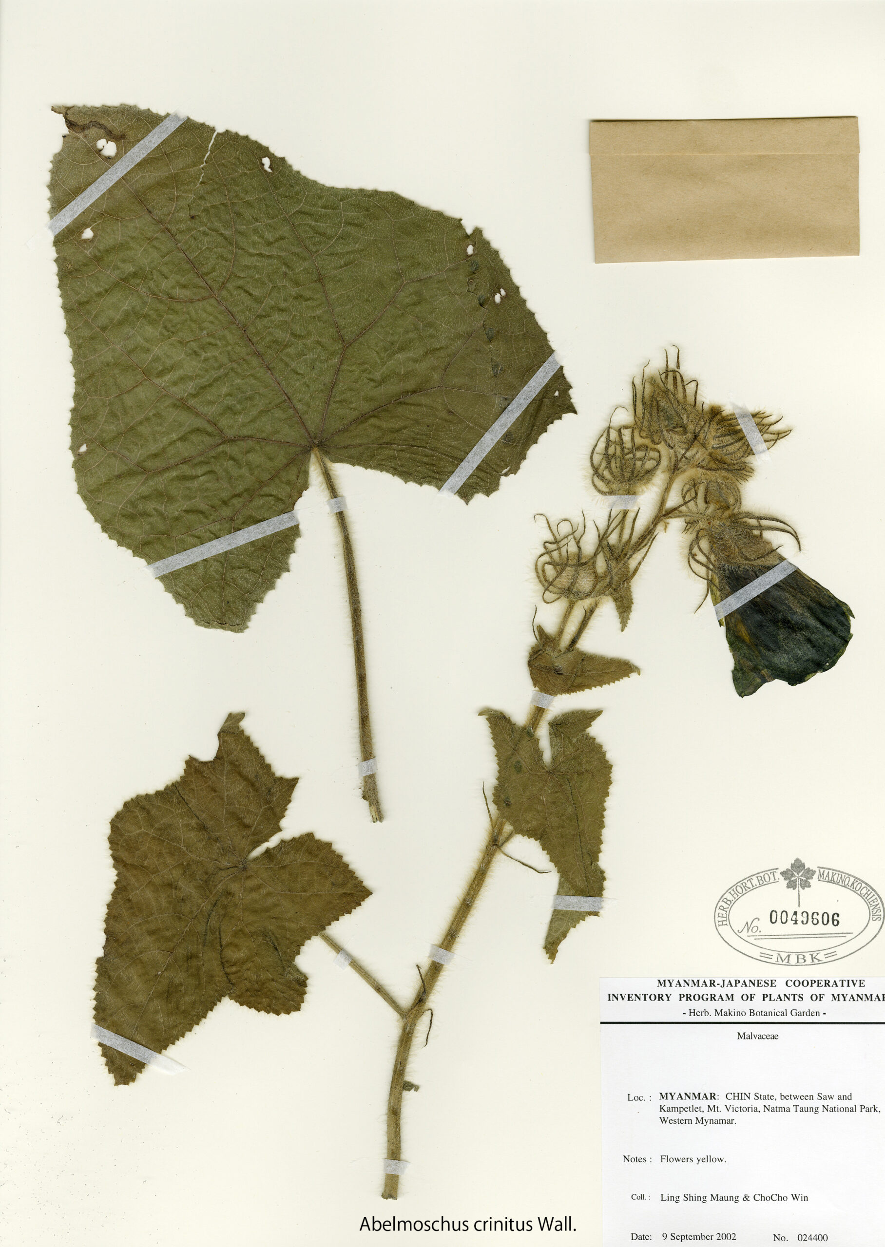 Malvaceae | Abelmoschus crinitus Wall. | MYANMAR: CHIN State, between Saw and Kampetlet, Mt. Victoria, Natma Taung National Park, Western Myanmar. | 9 September 2002 | Ling Shing Maung & Cho Cho Win; | 024400 | 0049606 |