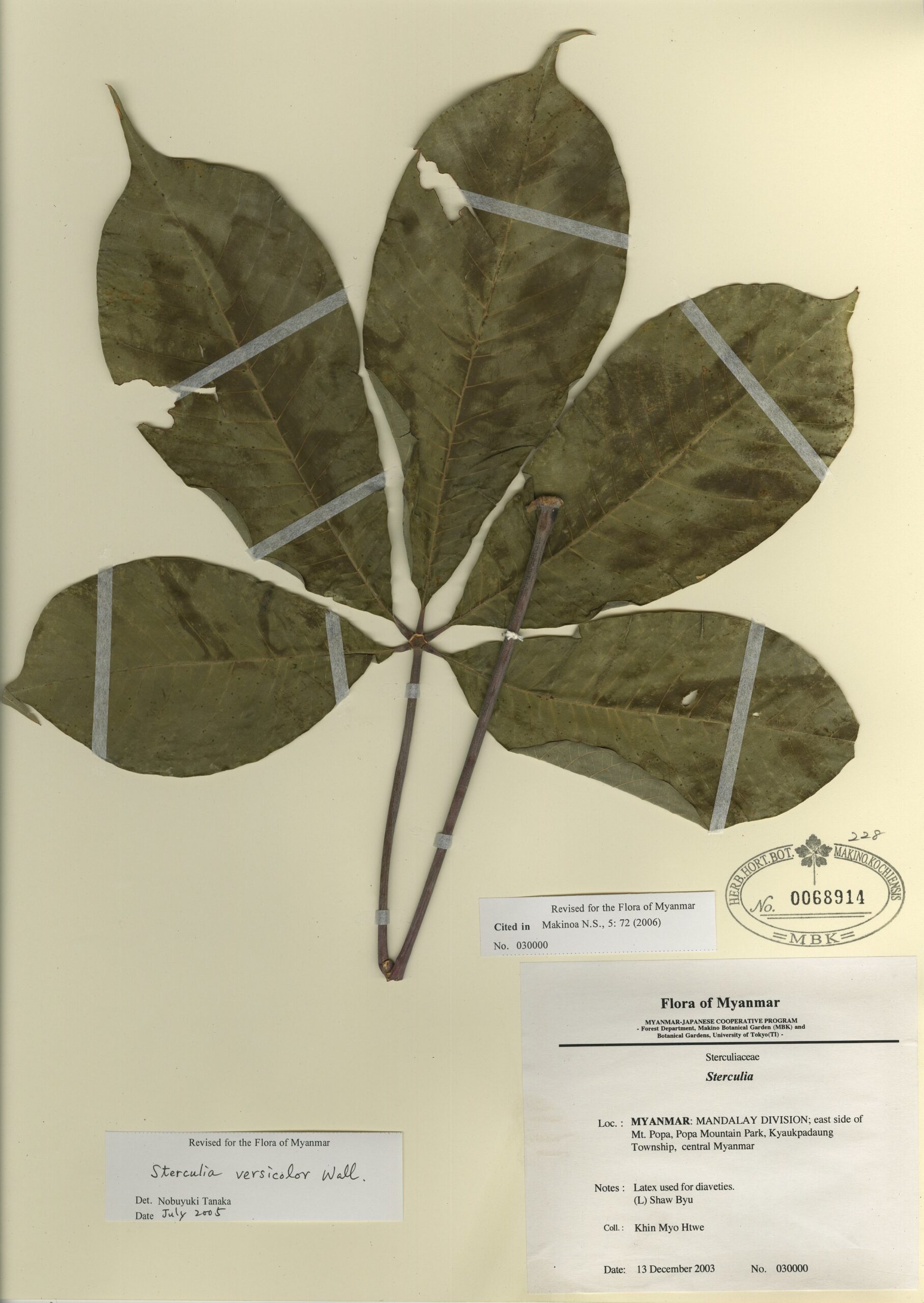 Malvaceae | Sterculia versicolor Wall. | MYANMAR: MANDALAY DIVISION; east side of Mt. Popa, Popa Mountain Park, Kyaukpadaung Township, central Myanmar | 13 December 2003 | Khin Myo Htwe; | 030000 | 0068914 |