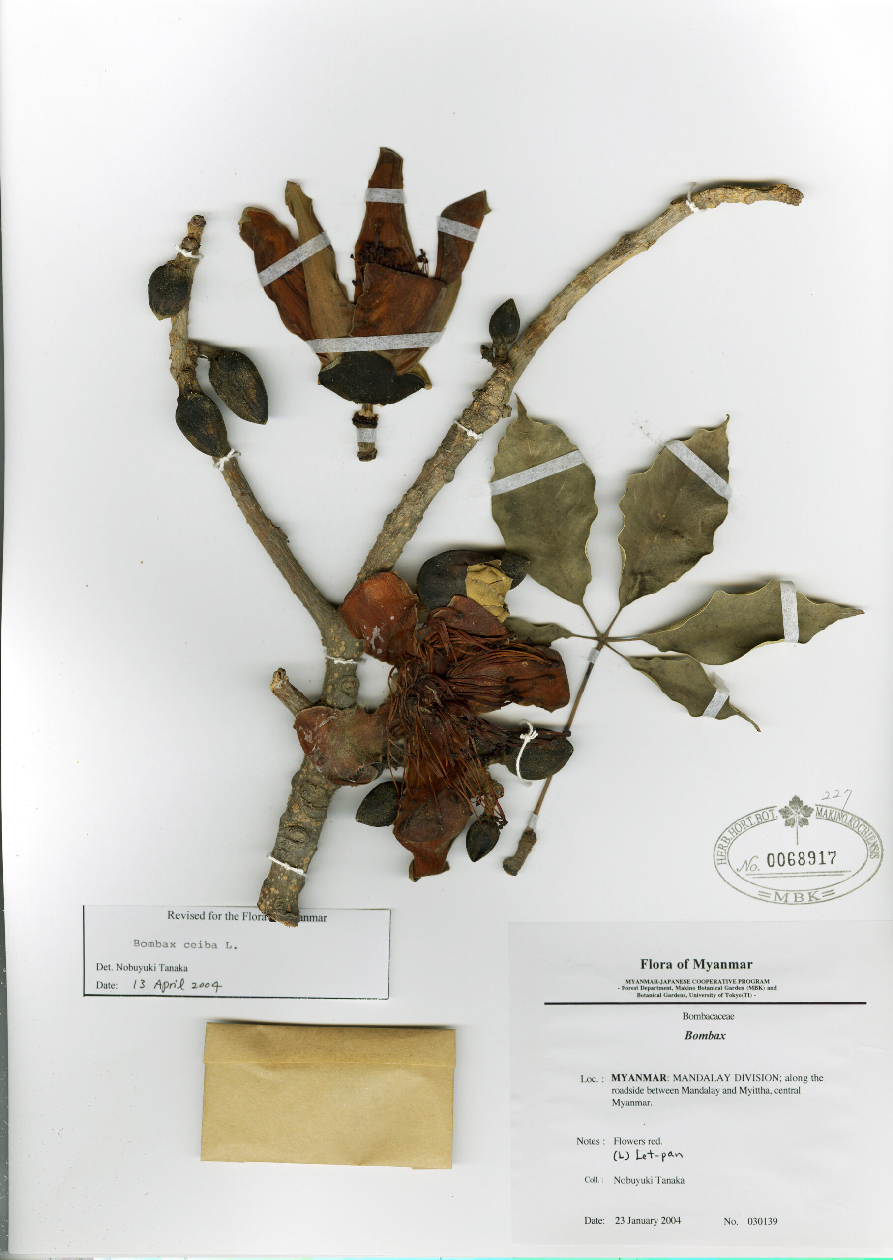 Malvaceae | Bombax ceiba L. | MYANMAR: MANDALAY DIVISION; along the roadside between Mandalay and Myittha, central Myanmar. | 23 January 2004 | Nobuyuki Tanaka; | 030139 | 0068917 |